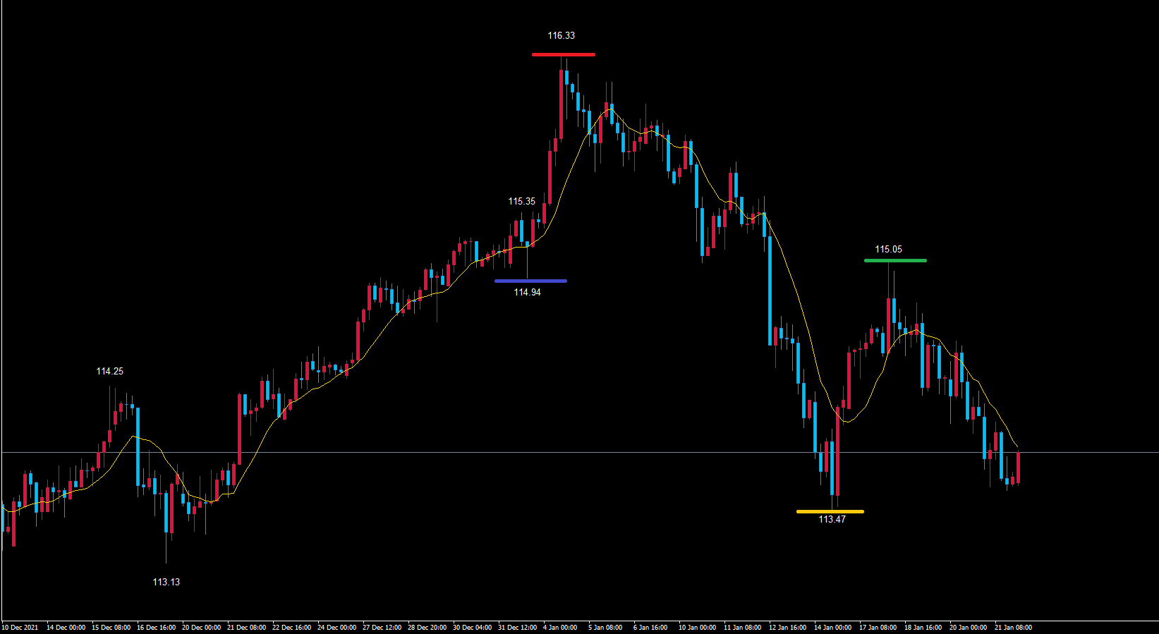 今週も続落する場合、14日の黄色のライン安値113.47が起点で見ていきます。