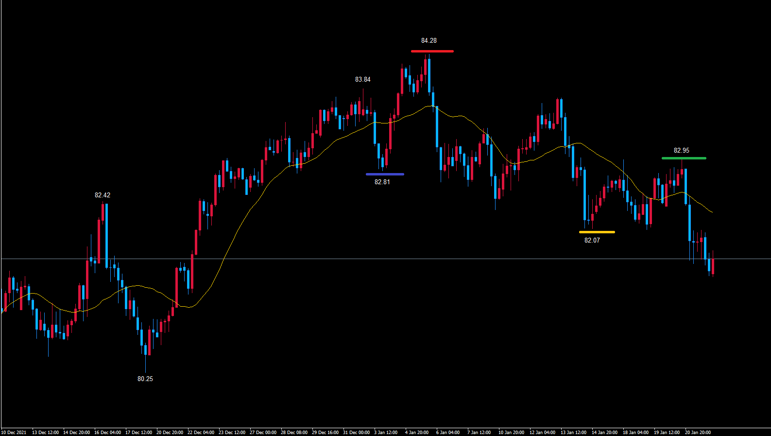 今週も続落する場合、14日の安値黄色のライン82.07が起点で見ていきます。