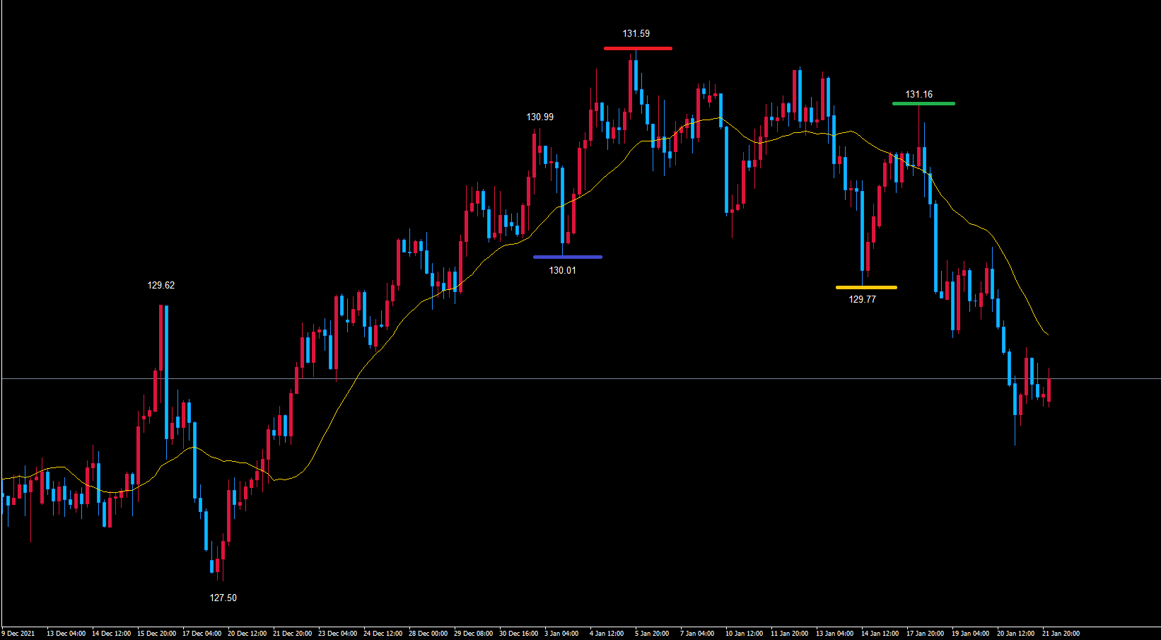 今週も続落する場合、14日の黄色のライン安値129.77が起点で見ていきます。