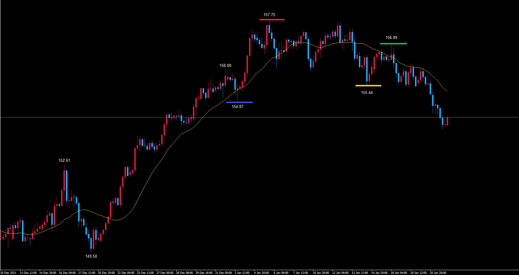 今週も続落する場合、14日の安値黄色のライン155.44が起点で見ていきます。