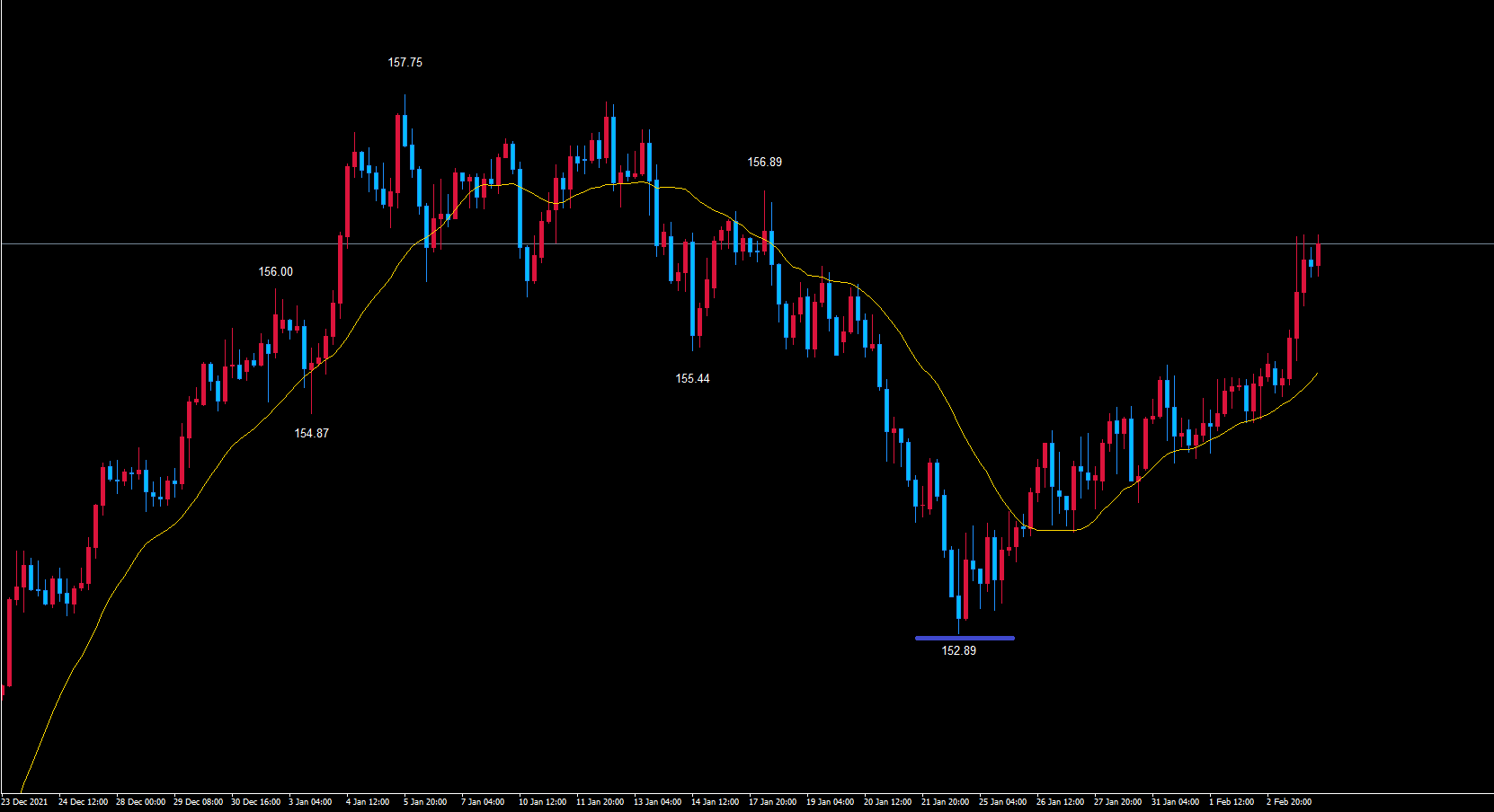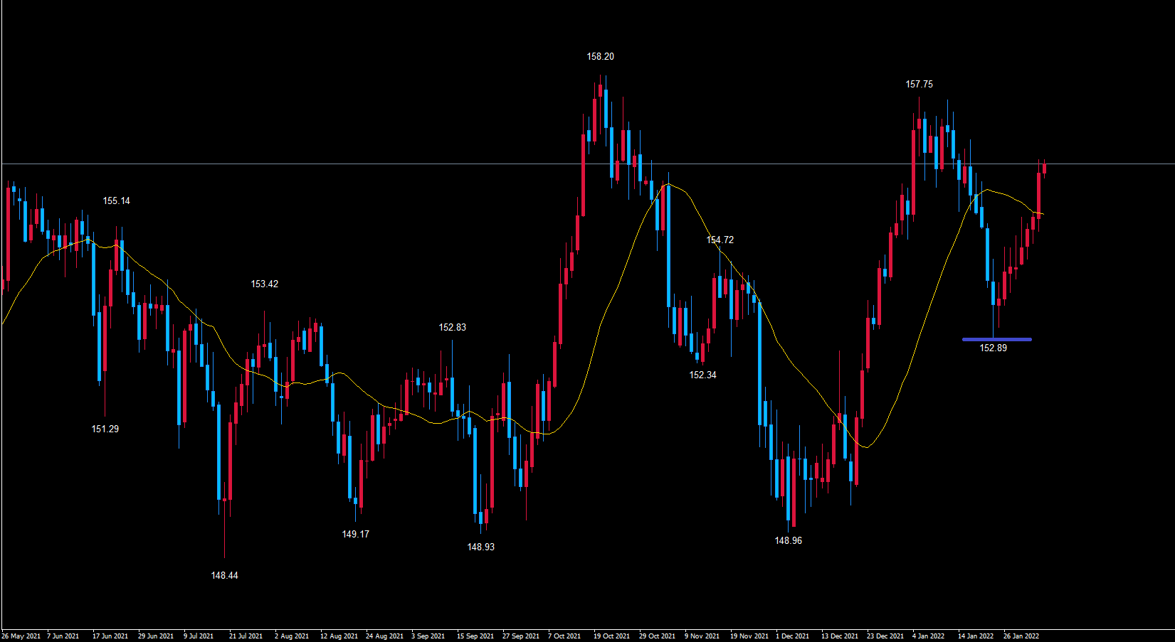 基準の本数内の36本目にサイクル内の最安値青のライン152.89を付けています。