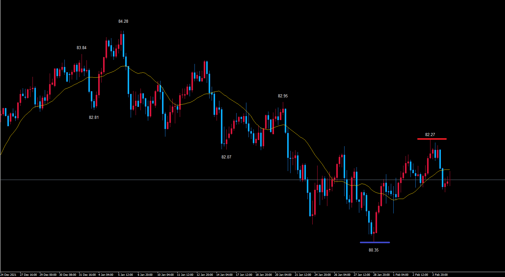 なので、豪ドル円の4時間サイクルもこれから高値赤のライン82.27を更新してライトトランスレーションの形成する可能性も考えられます。