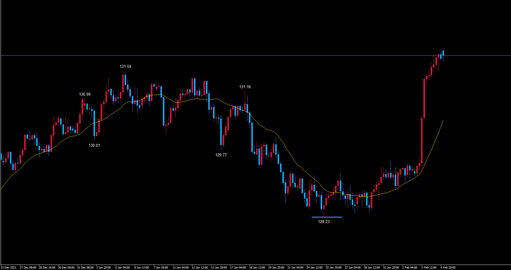 ユーロ円4時間サイクルは、起点の青のライン128.23から現在51本目です。