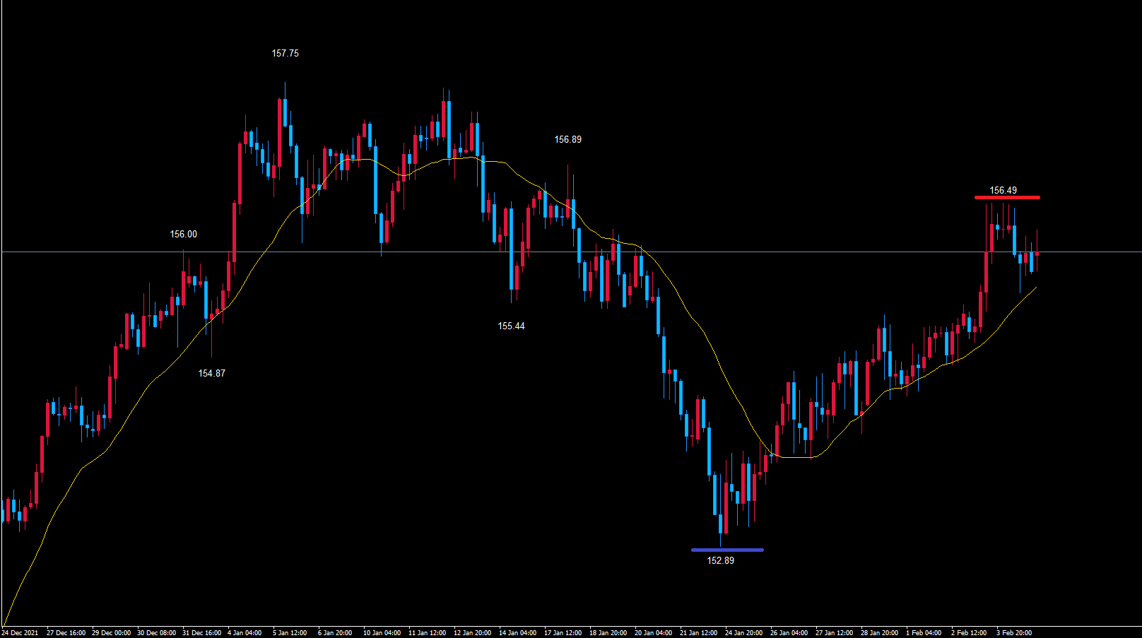 現在は天井の時間帯(本数)に入っているので、赤のライン156.49で天井を付けている可能性がありますが、