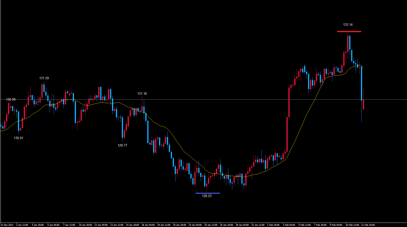 ユーロ円4時間サイクルは、起点の青のライン128.23から現在81本目です。