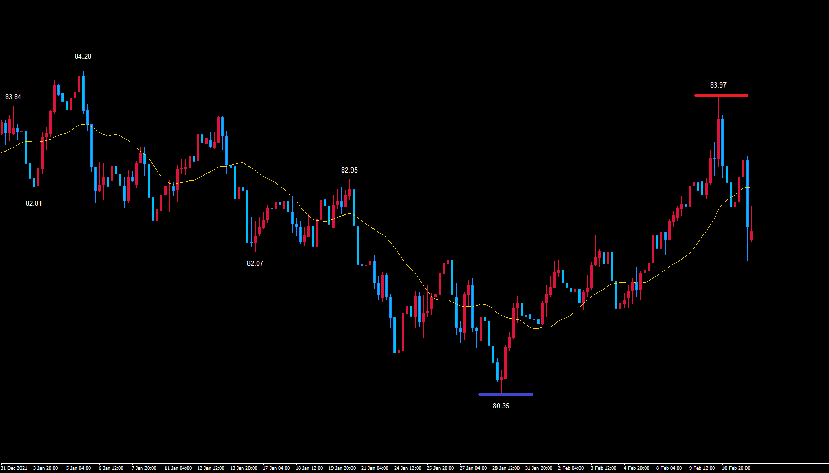 このサイクルは、天井の赤のライン83.97を54本目に付けているので、ライトトランスレーションのサイクルを形成する可能性が高く、