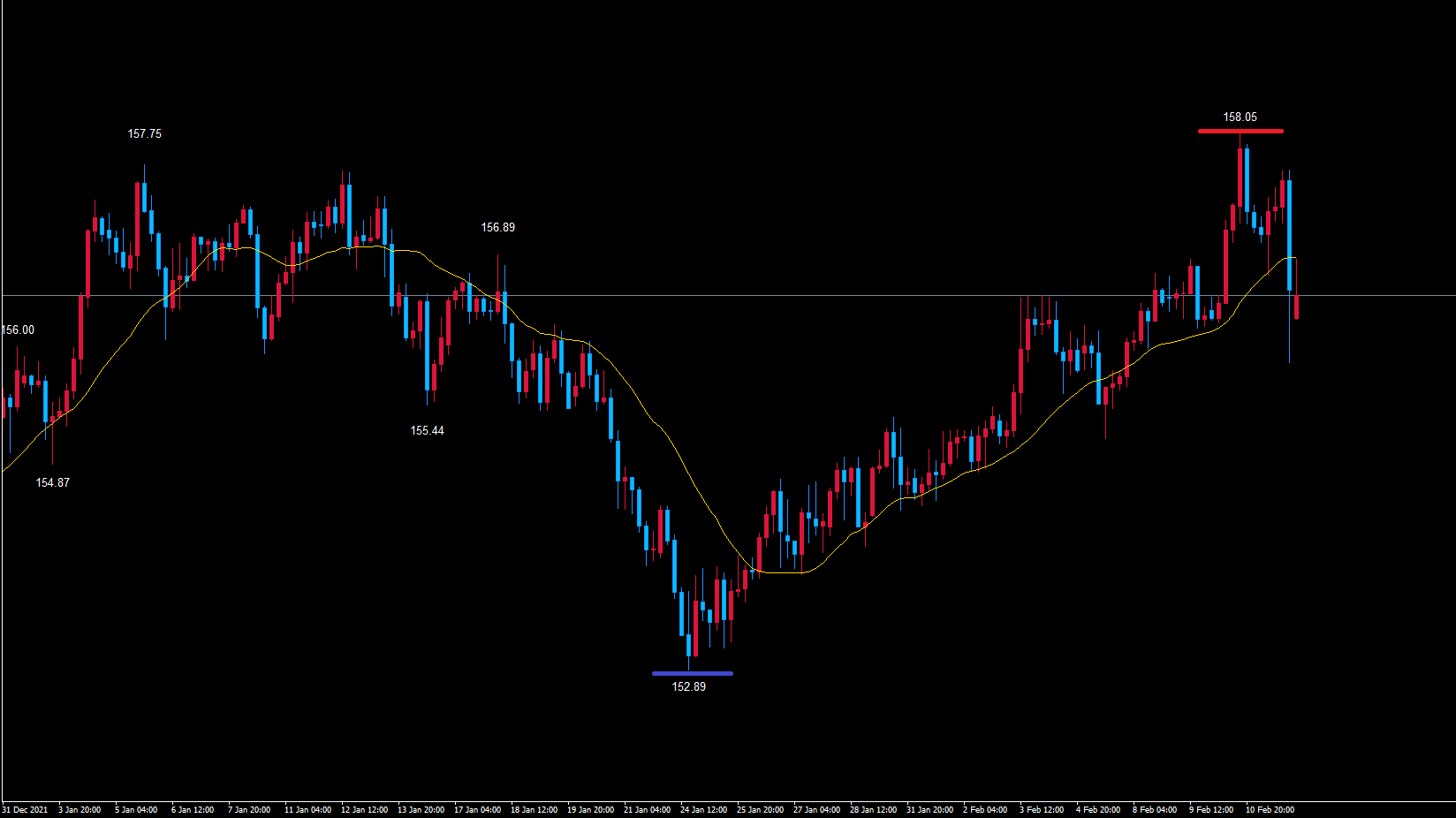 ポンド円4時間サイクルは、起点の青のライン152.89から現在87本目です。