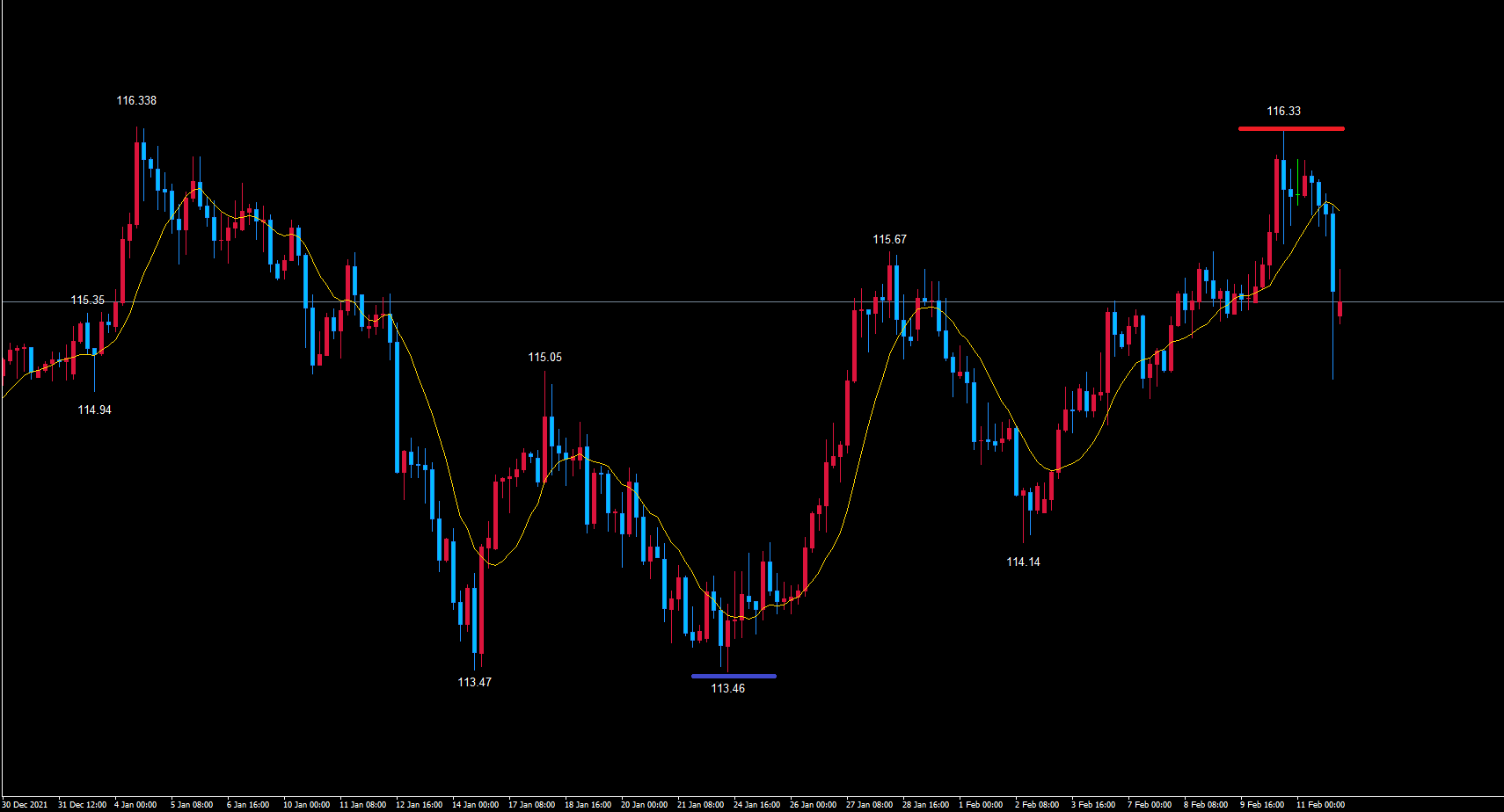 また、このサイクルは、天井の赤のライン116.33を80本目に付けているので、ライトトランスレーションのサイクルを形成する可能性が高く、