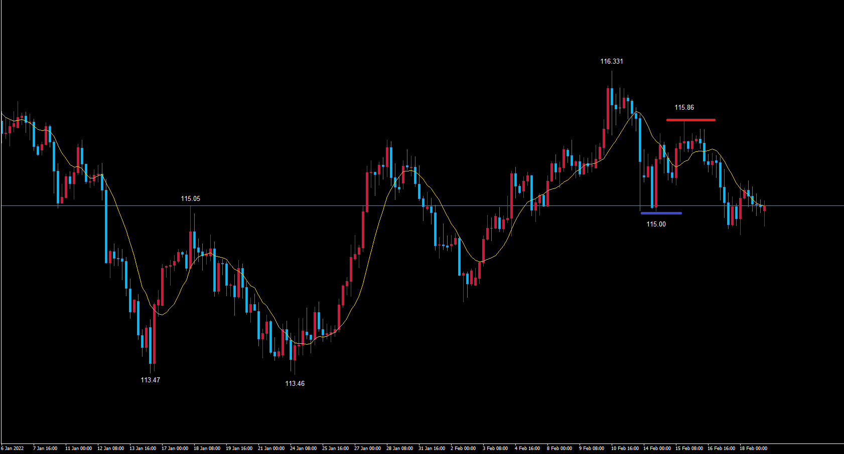 つまり、8本目に付けたサイクル内最高値の赤のライン115.86が天井で現在は底へ向けて下落中という事です。