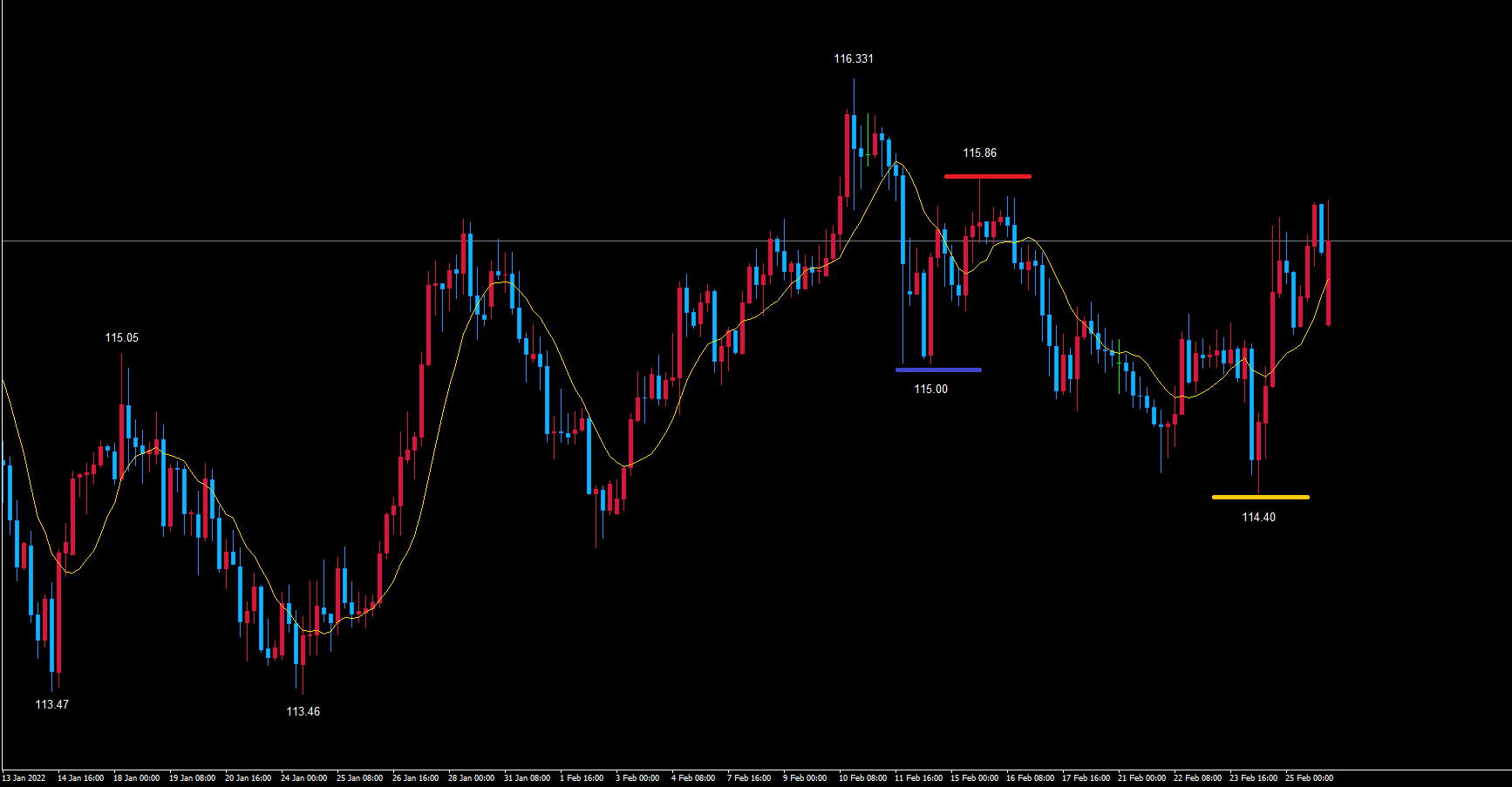これから天井の赤のライン115.86を超える場合、黄色のライン114.40で反転している事が確定します。