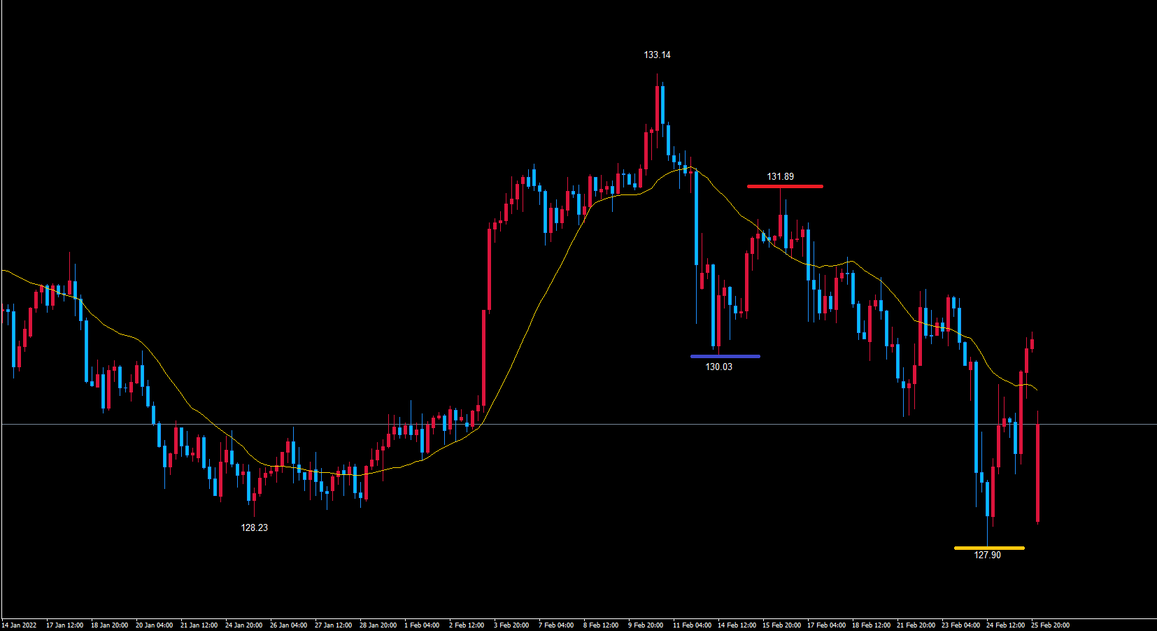 また、今後黄色のライン127.90を割れずに動くのであれば、黄色のライン127.90で反転と判断していきます。