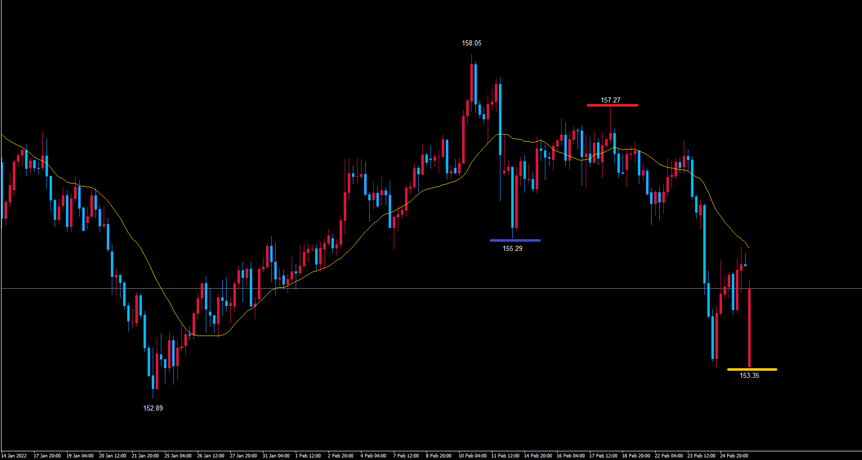 また、今後黄色のライン153.35を割れずに動くのであれば、黄色のライン153.35で反転と判断していきます。