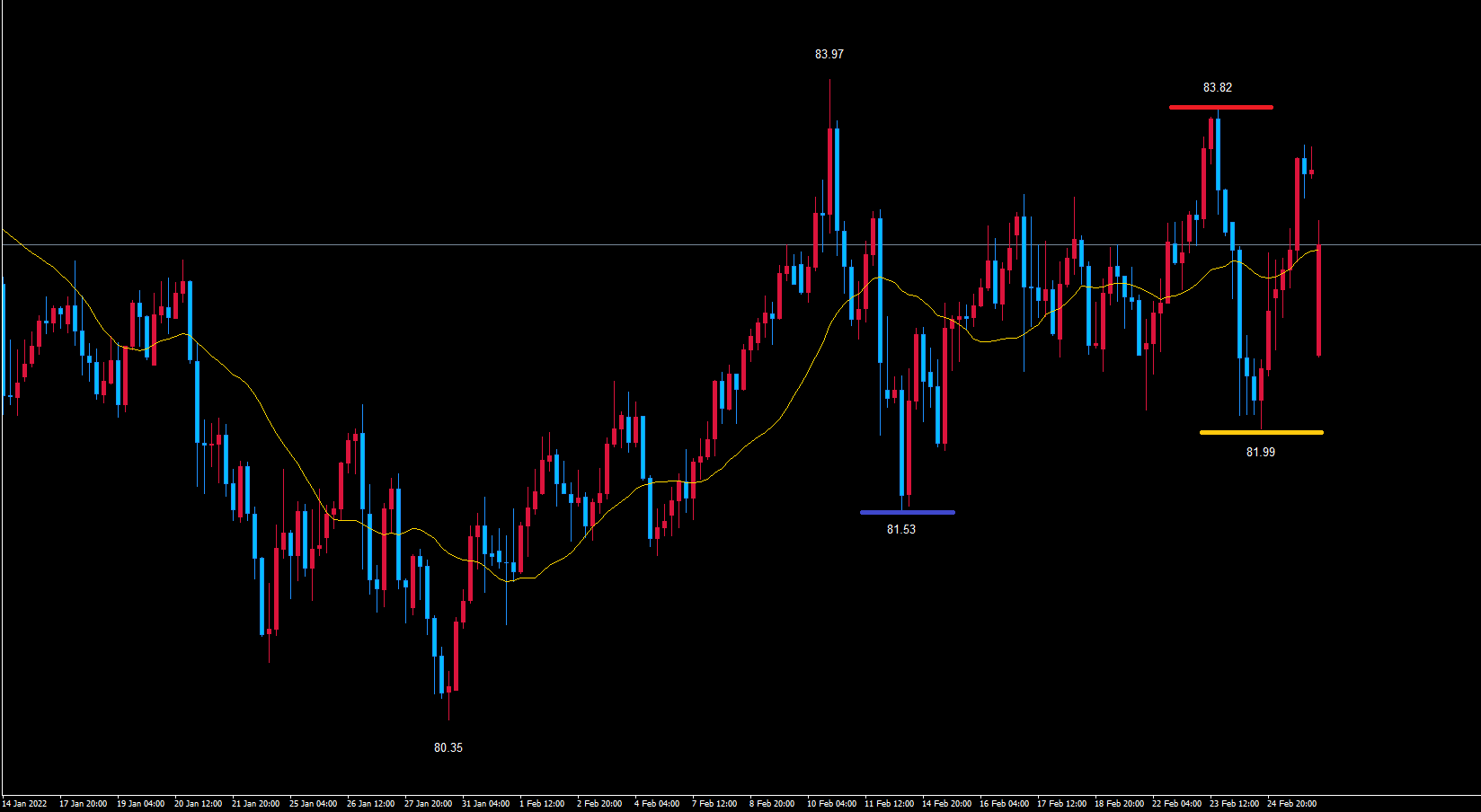 また、今後黄色のライン81.99を割れずに動くのであれば、黄色のライン81.99で反転と判断していきます。