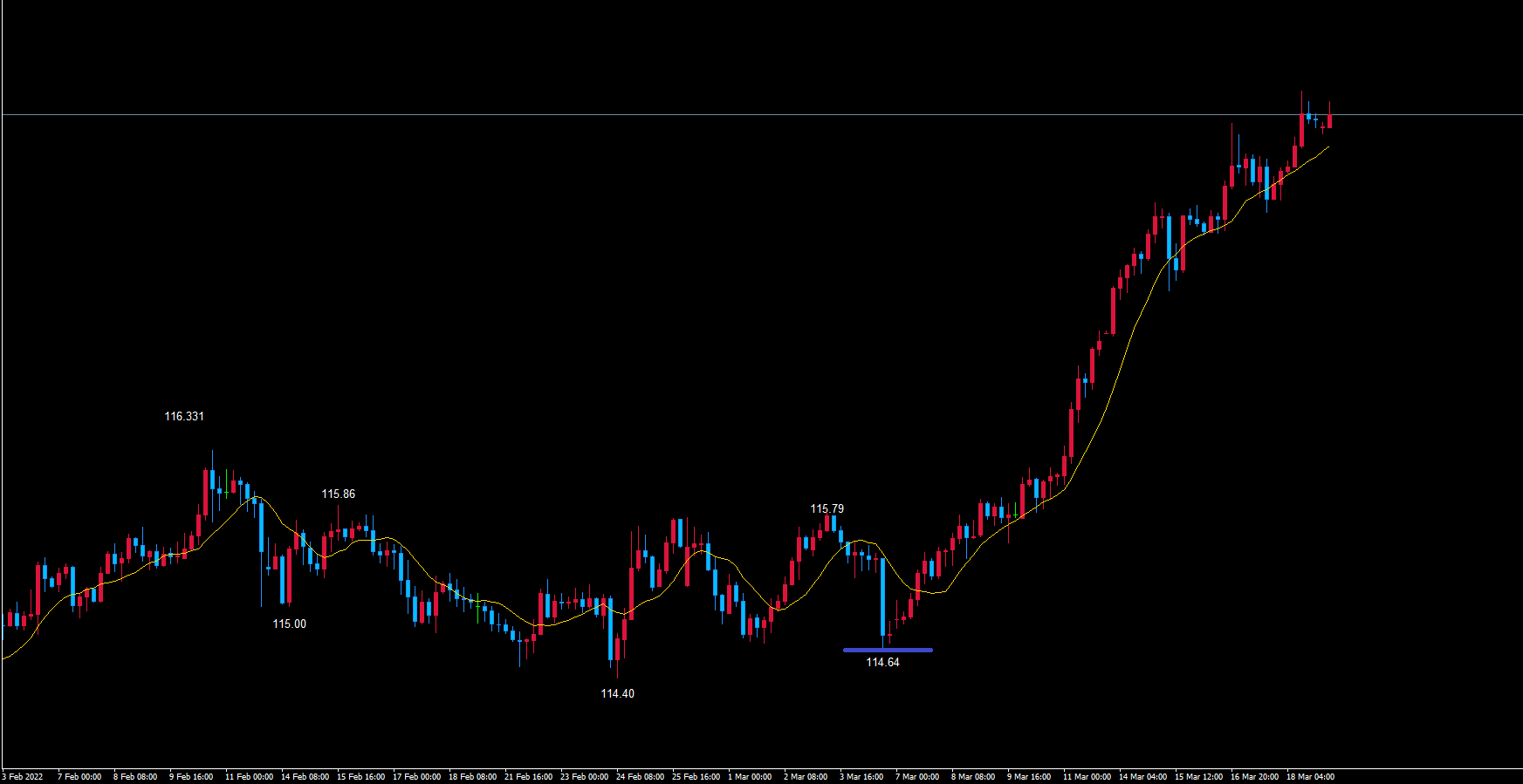 つまり、中央より右側で天井を付けて、起点の青のライン114.65以上で底を付けるサイクルになるという事です。