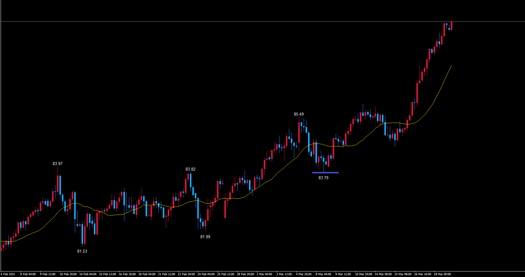 また、ライトトランスレーションのサイクルという事は、天井を付けて下落しても起点の青のライン83.79以上で底を付けるので頭に入れておいてください。