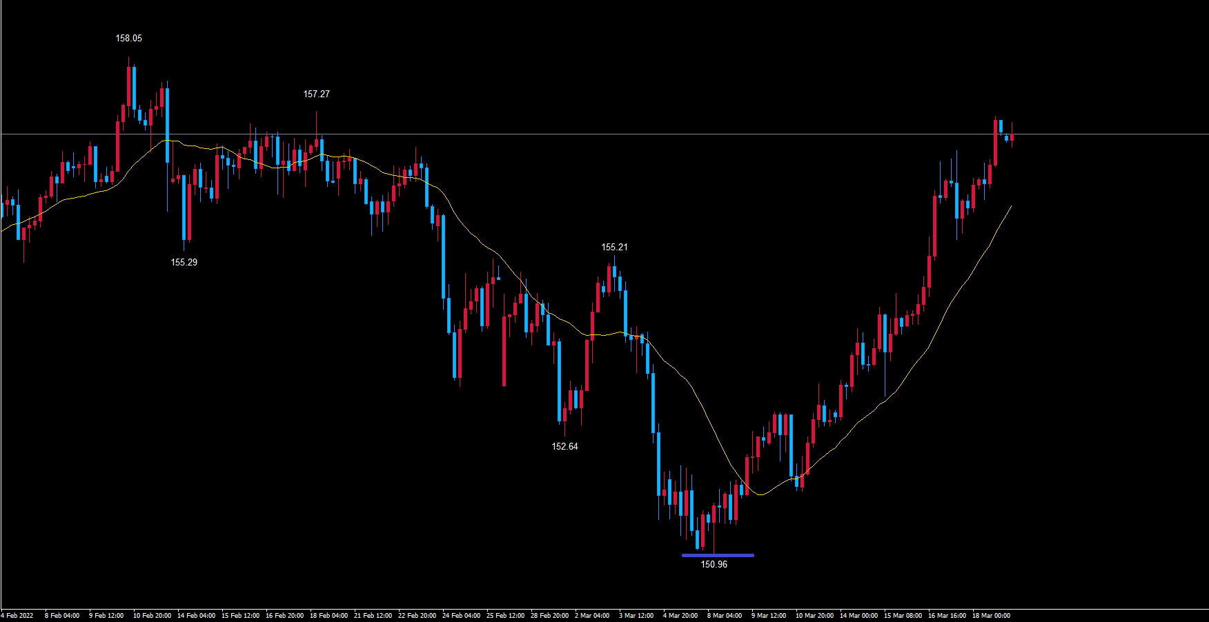 ポンド円4時間サイクルは、起点の青のライン150.96から現在55本目です。