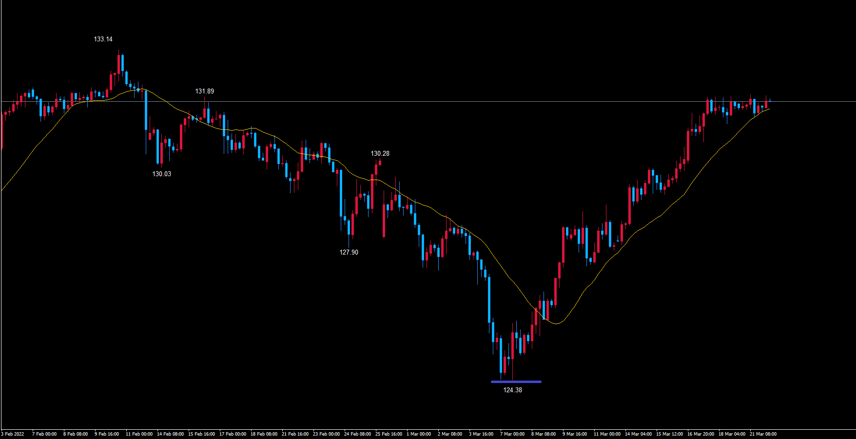 また、今回はライトトランスレーションのサイクルなので、天井を付けて下落しても、起点の青のライン124.38以上で底を付けるので、