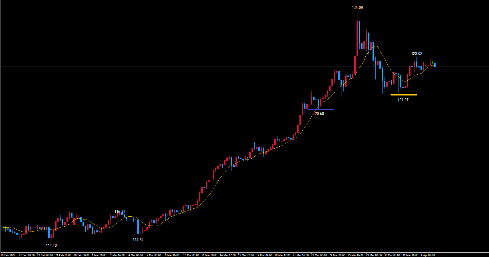 黄色のラインからのサイクルの場合は、1日の高値123.02で天井を付けている可能性もあるので天井からショートが狙えます。