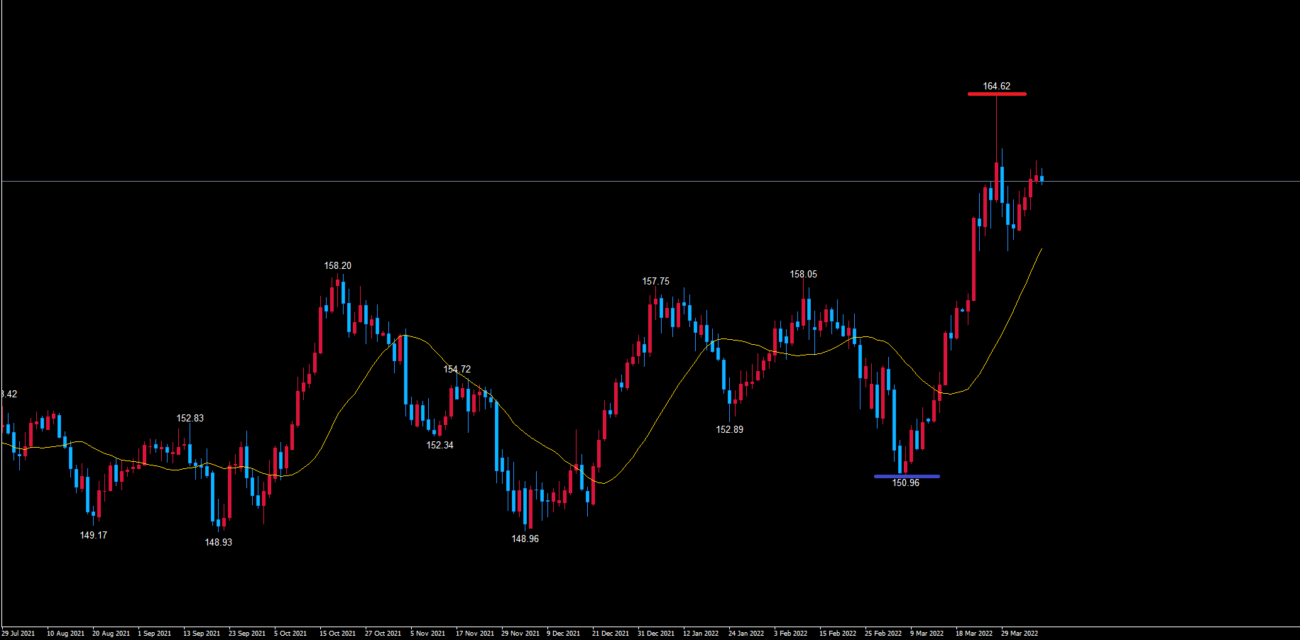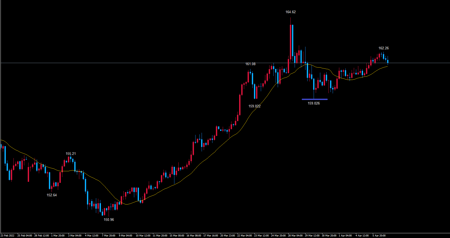 ユーロ円が今後4月1日の高値を超えれば、4月5日の安値が起点 そして 4月5日の安値を割れれば3月31日の安値が起点。