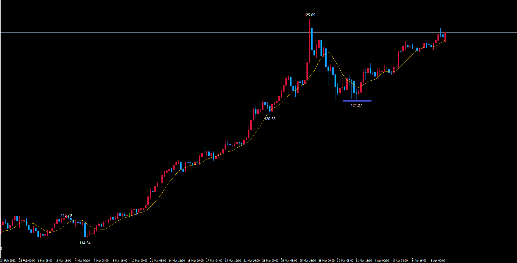ドル円4時間サイクルは、起点の青のライン121.27から現在39本目です。