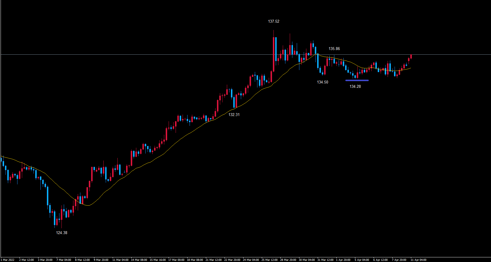 なので、ユーロ円の4時間サイクルは、青のライン134.28が起点のサイクルと見ていきます。