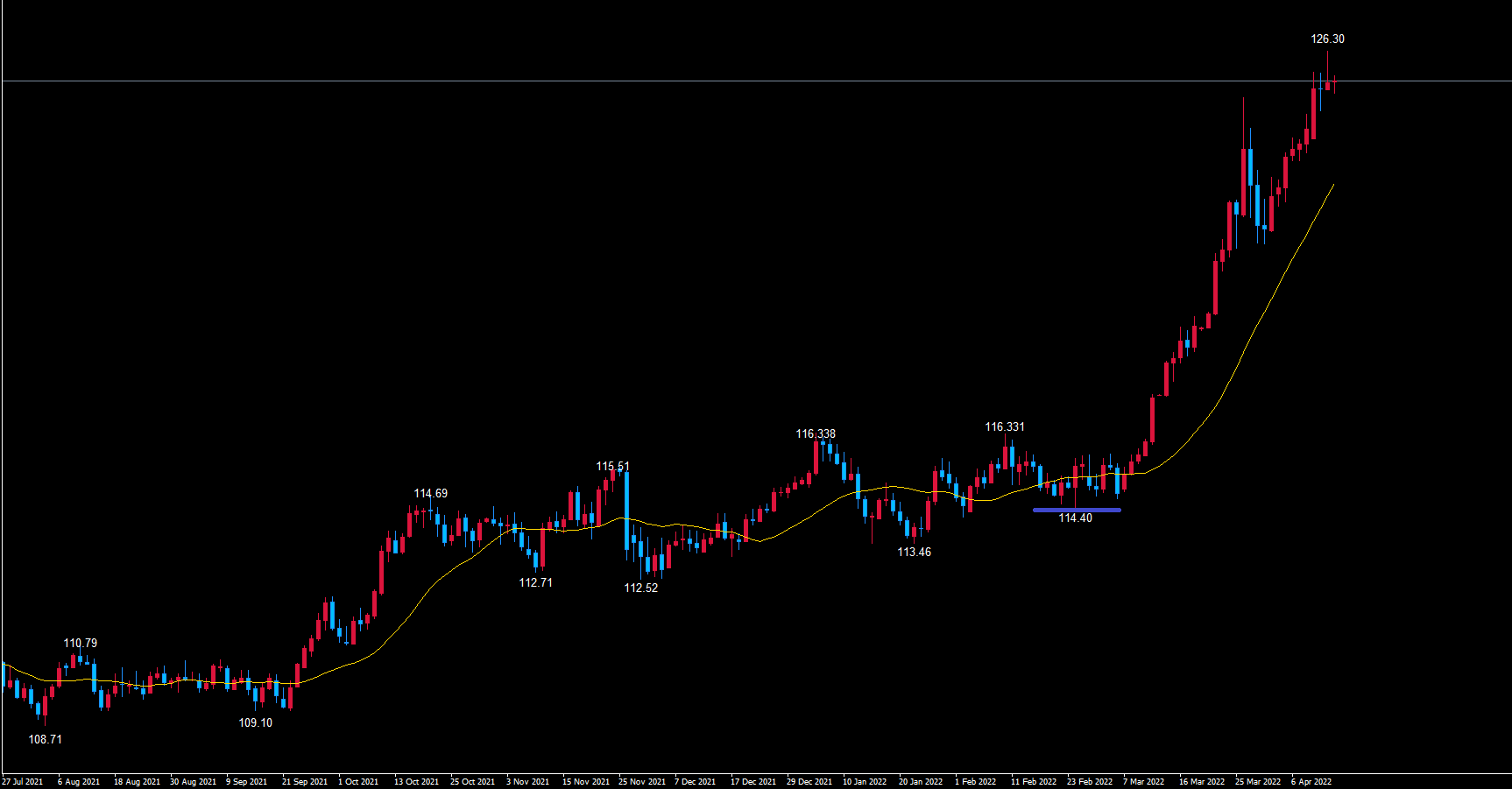 また、昨日53本目にサイクル内最高値126.30を付けているので、既に天井を付けている可能性も考えています。