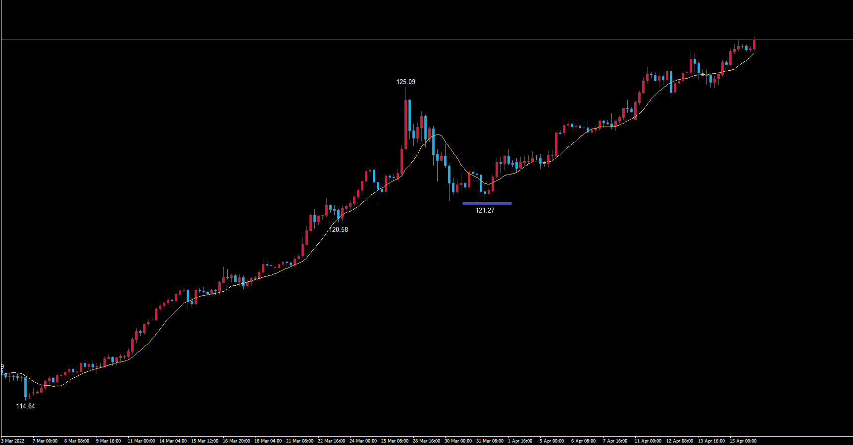 ドル円4時間サイクルは、起点の青のライン121.27から現在69本目です。