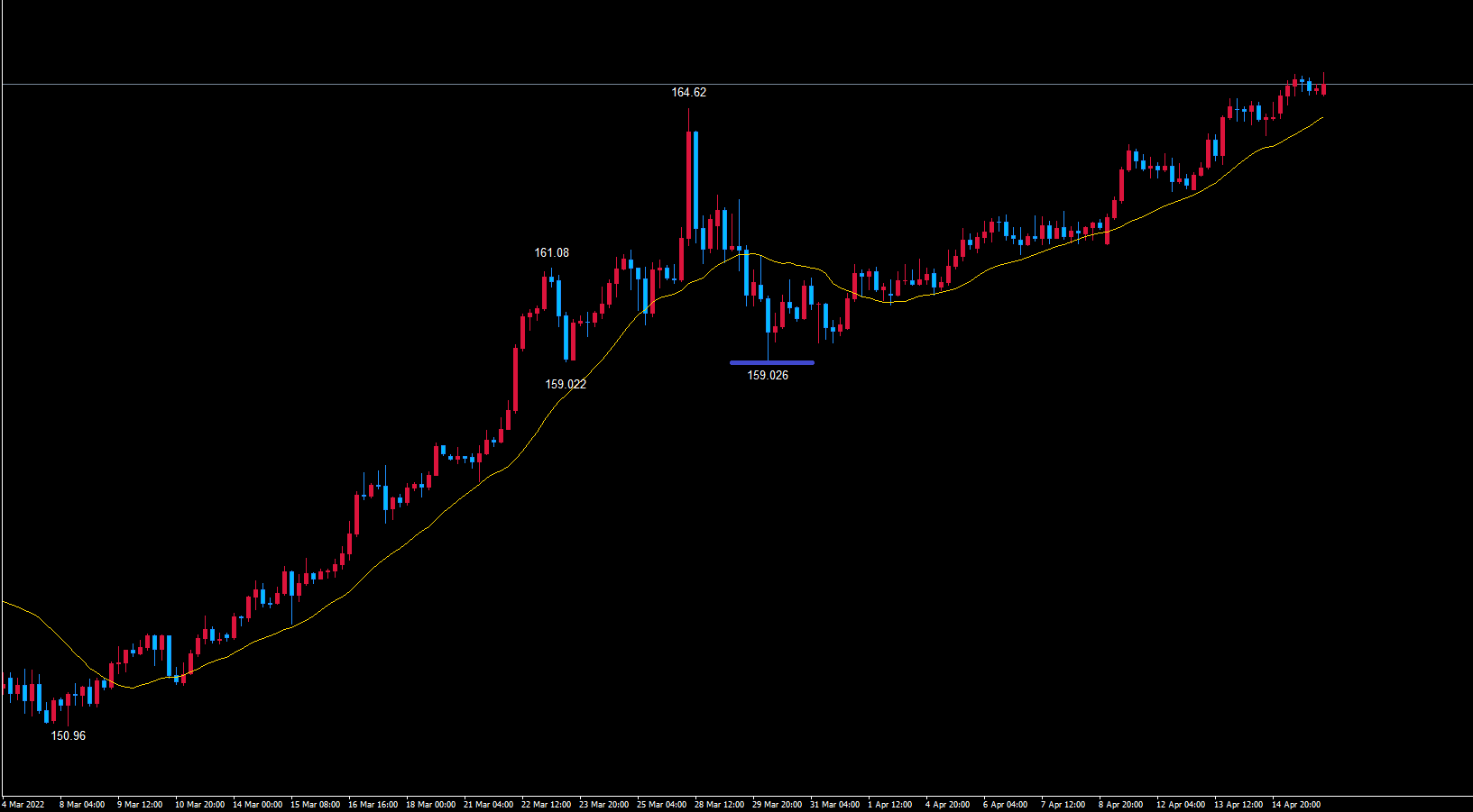 ポンド円4時間サイクルは、起点の青のライン159.026から現在78本目です。