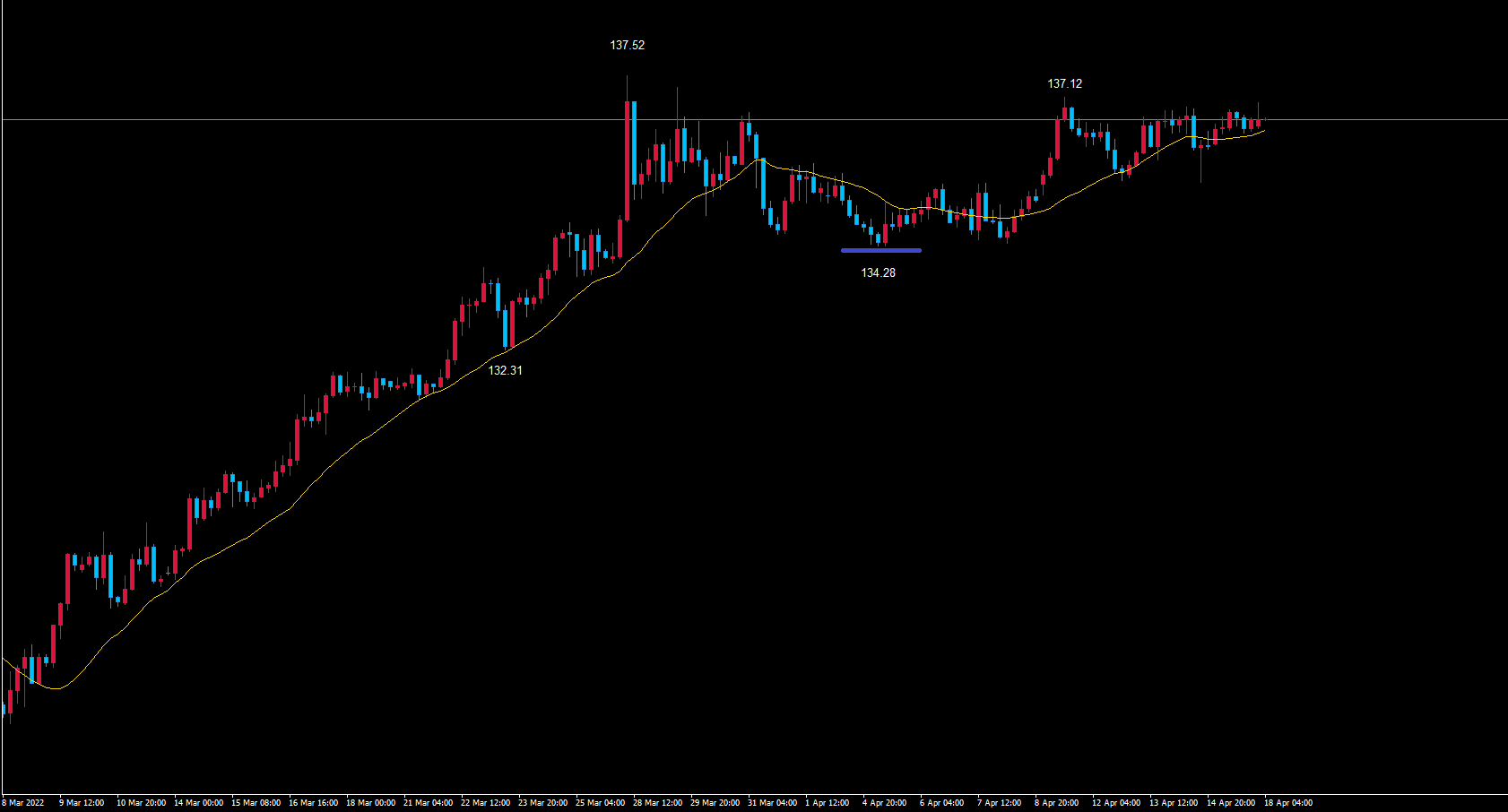 ユーロ円4時間サイクルは、起点の青のライン134.28から現在54本目です。
