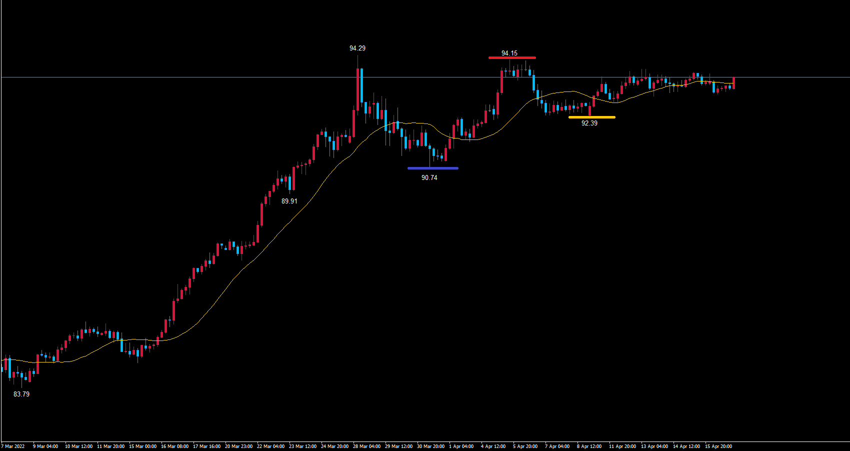 ただ、赤のライン94.15で天井を付けていて、底を付けるにしても直近の安値黄色のライン92.39を割れていく必要があるので頭に入れておきます。