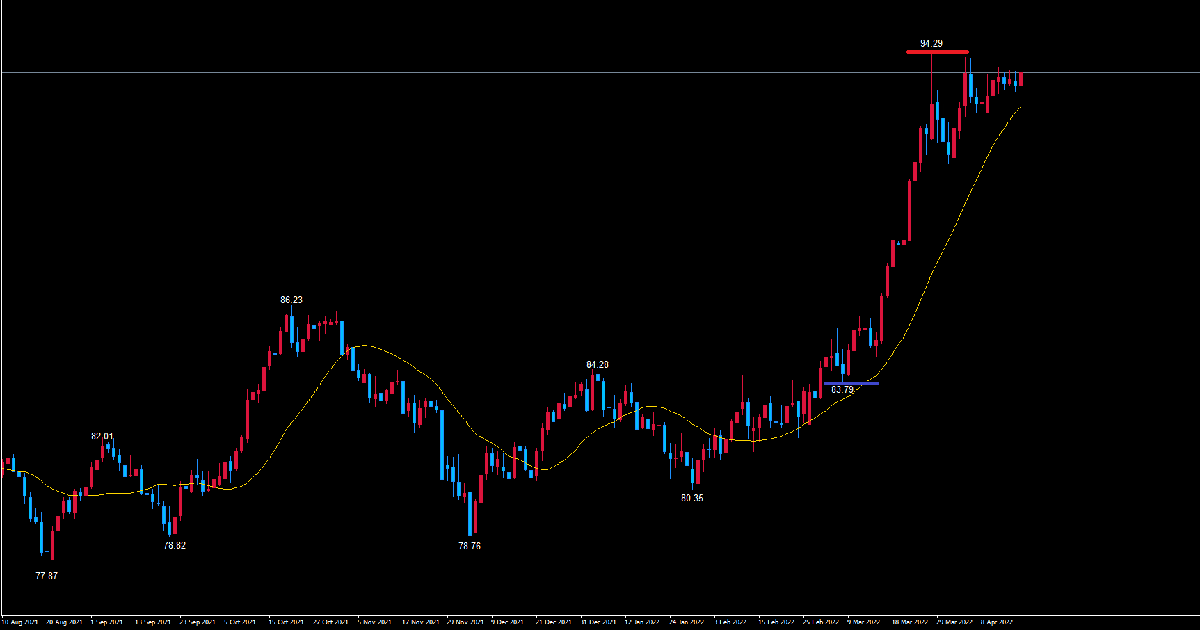 現在は変わらず中央より左側でサイクル内最高値赤のライン94.15を付けているので、レフトトランスレーションのサイクルを形成する可能性があります。