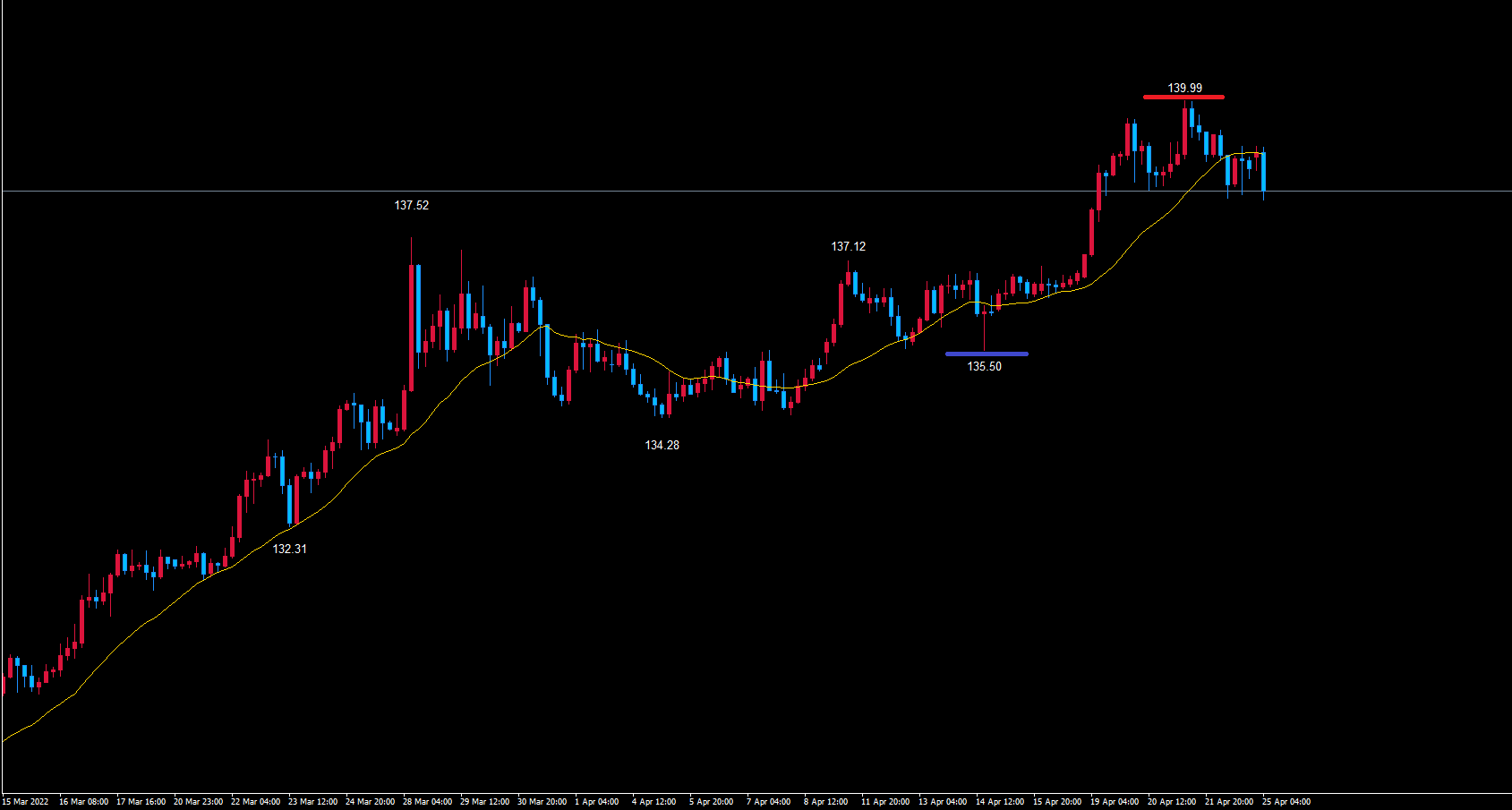 ユーロ円4時間サイクルは青のライン135.50から現在40本目です。