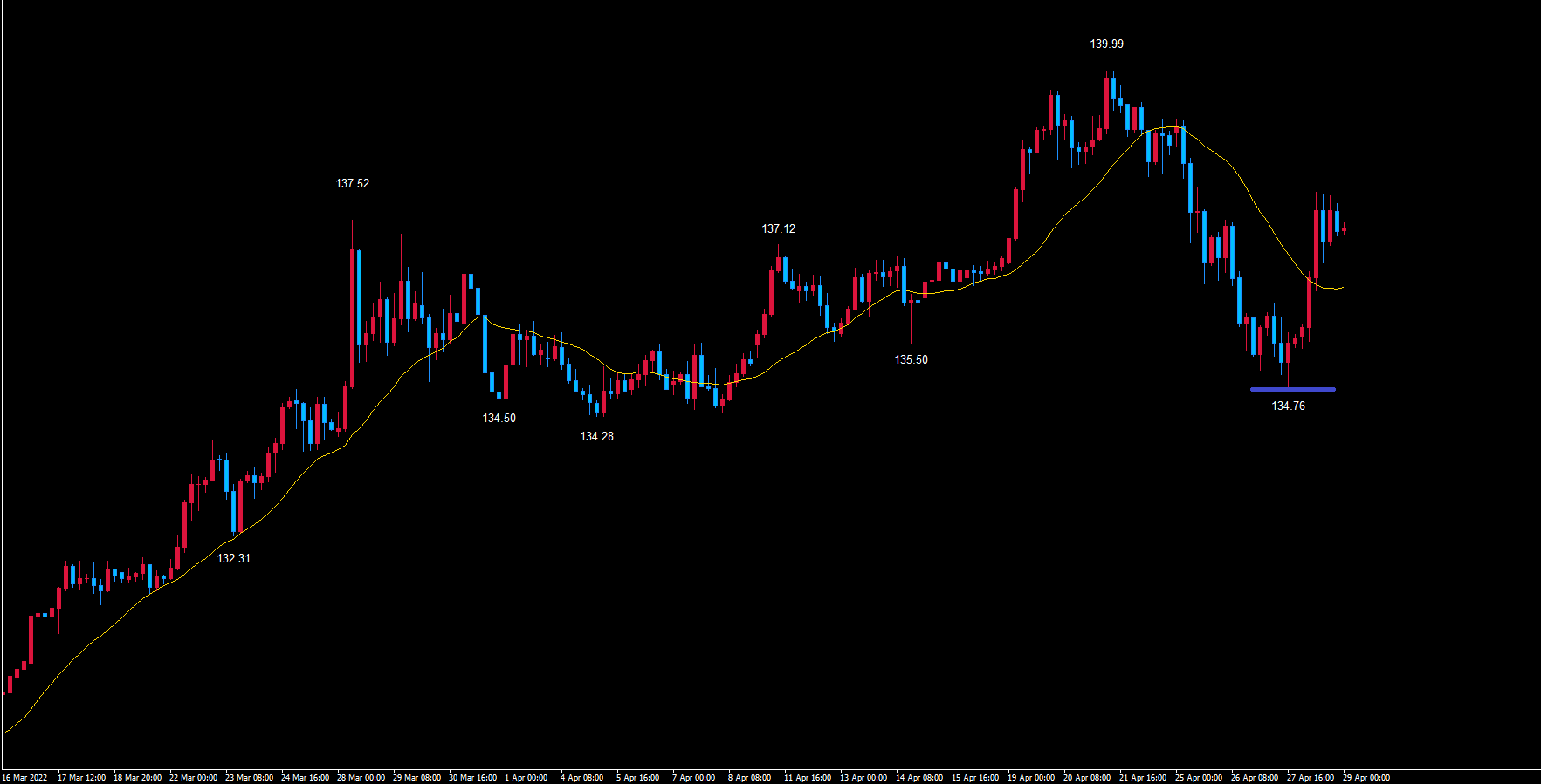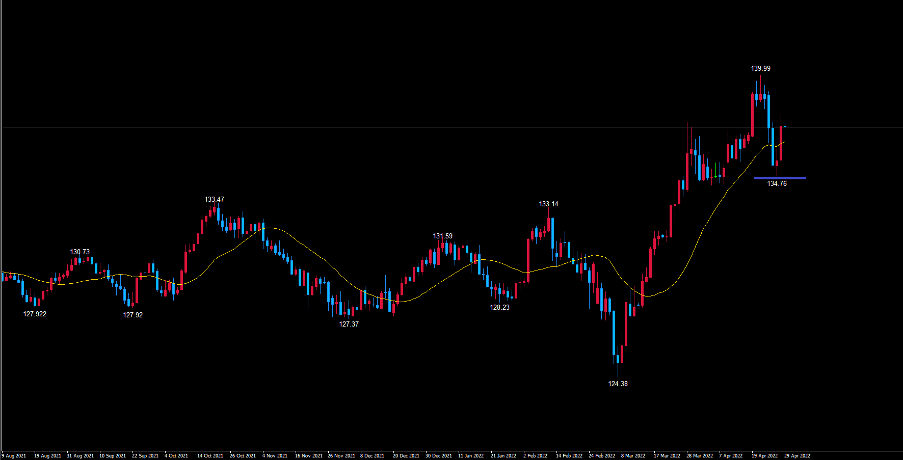 週足の上昇トレンドの押し目のタイミングになるので青のライン134.76を意識してロング狙いで見ていきます。