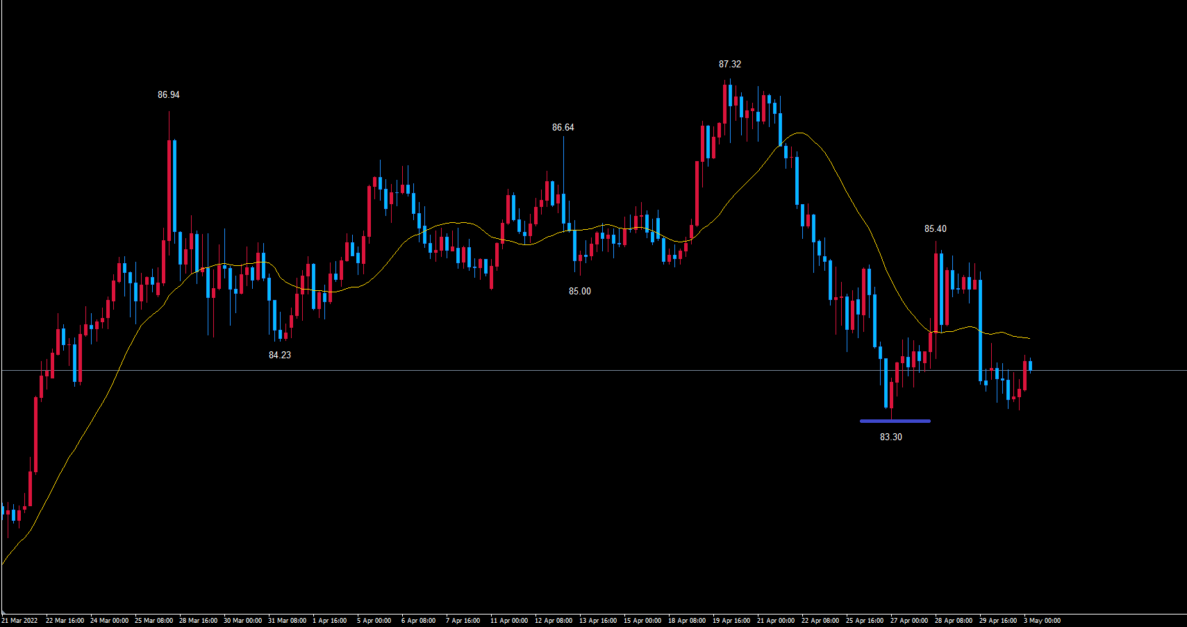 NZドル円の4時間サイクルは、起点の青のライン83.30付近まで下落しています。