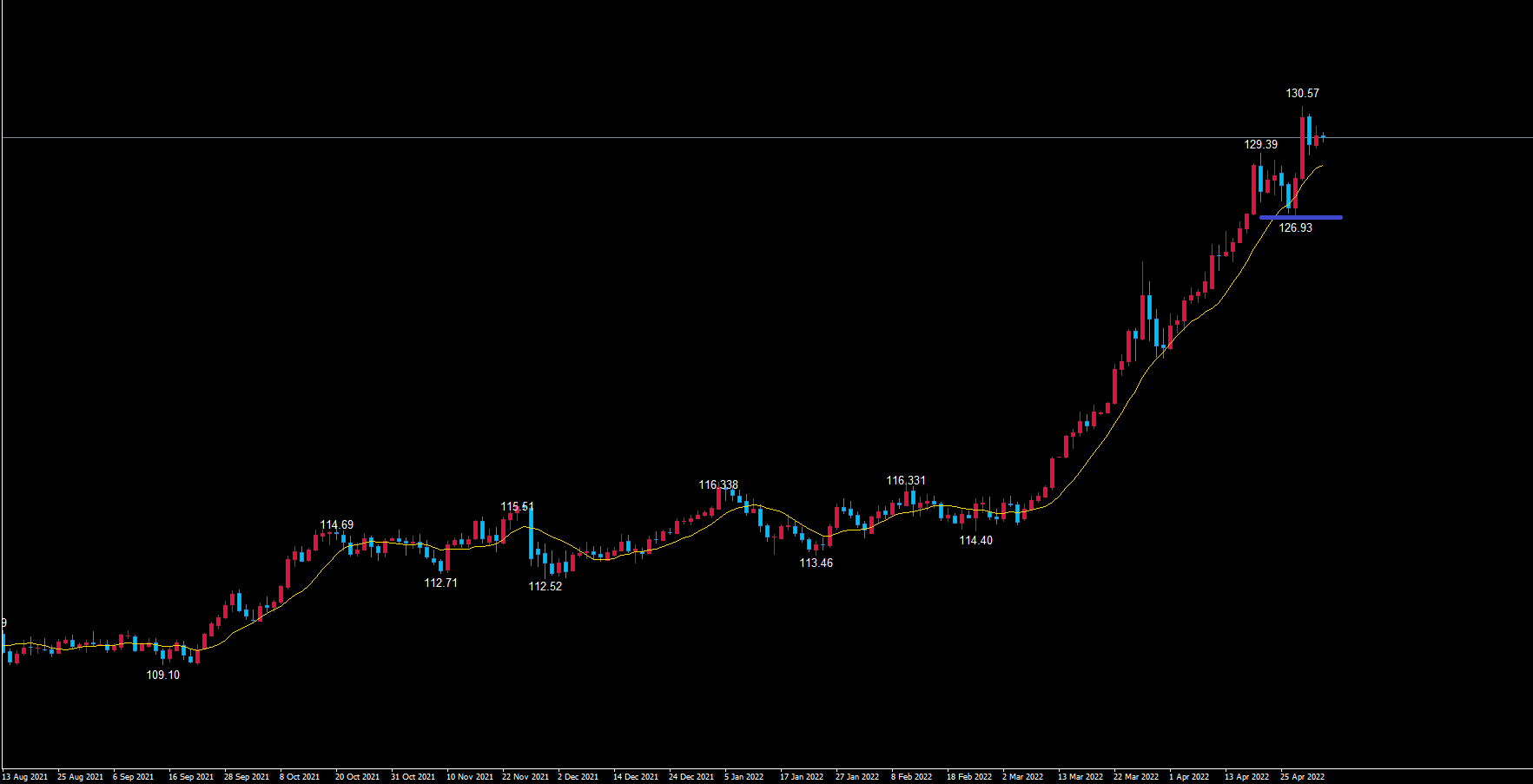 週足の上昇トレンドの押し目のタイミングになるので青のライン126.93を意識してロング狙いで見ていきます。