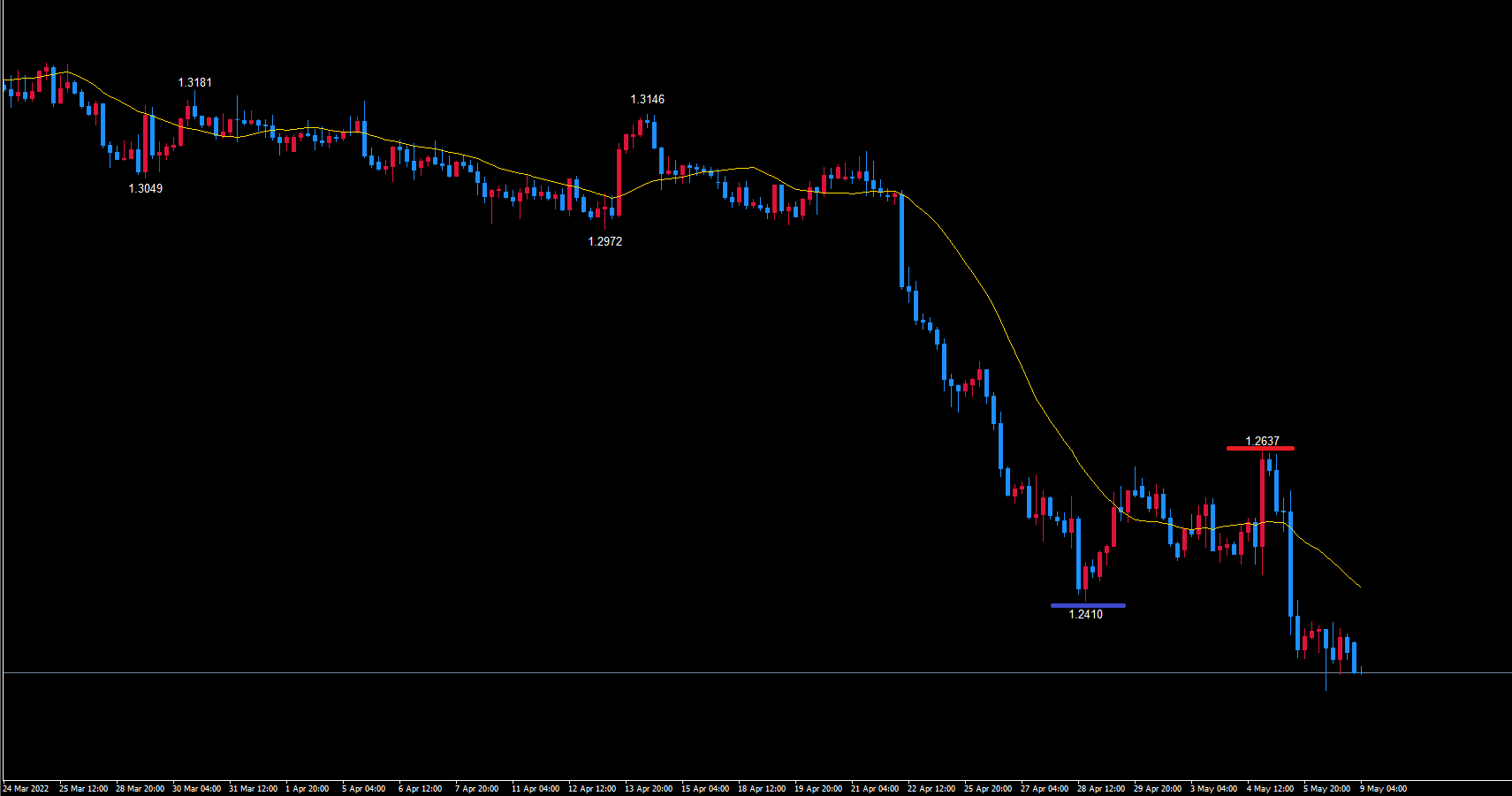天井は赤のライン1.2637という事が確定していて、現在は底へ向けて下落中です。