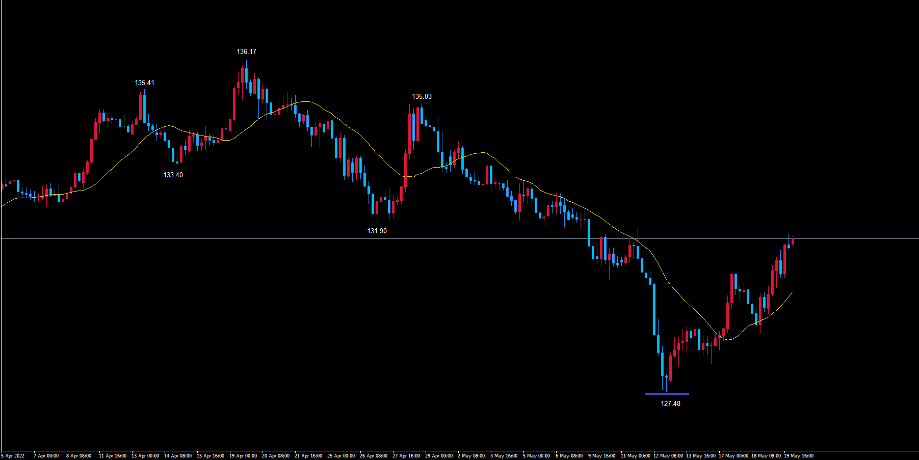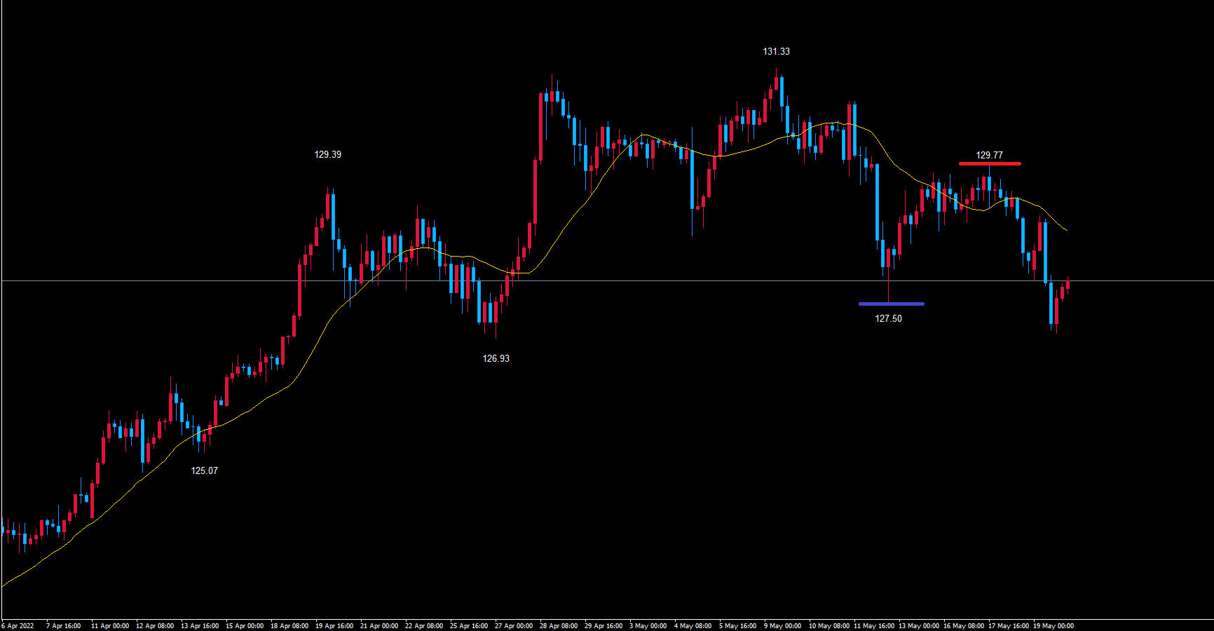 このサイクルは昨日起点の青のライン127.50を割れた事でレフトトランスレーションのサイクルが確定しました。