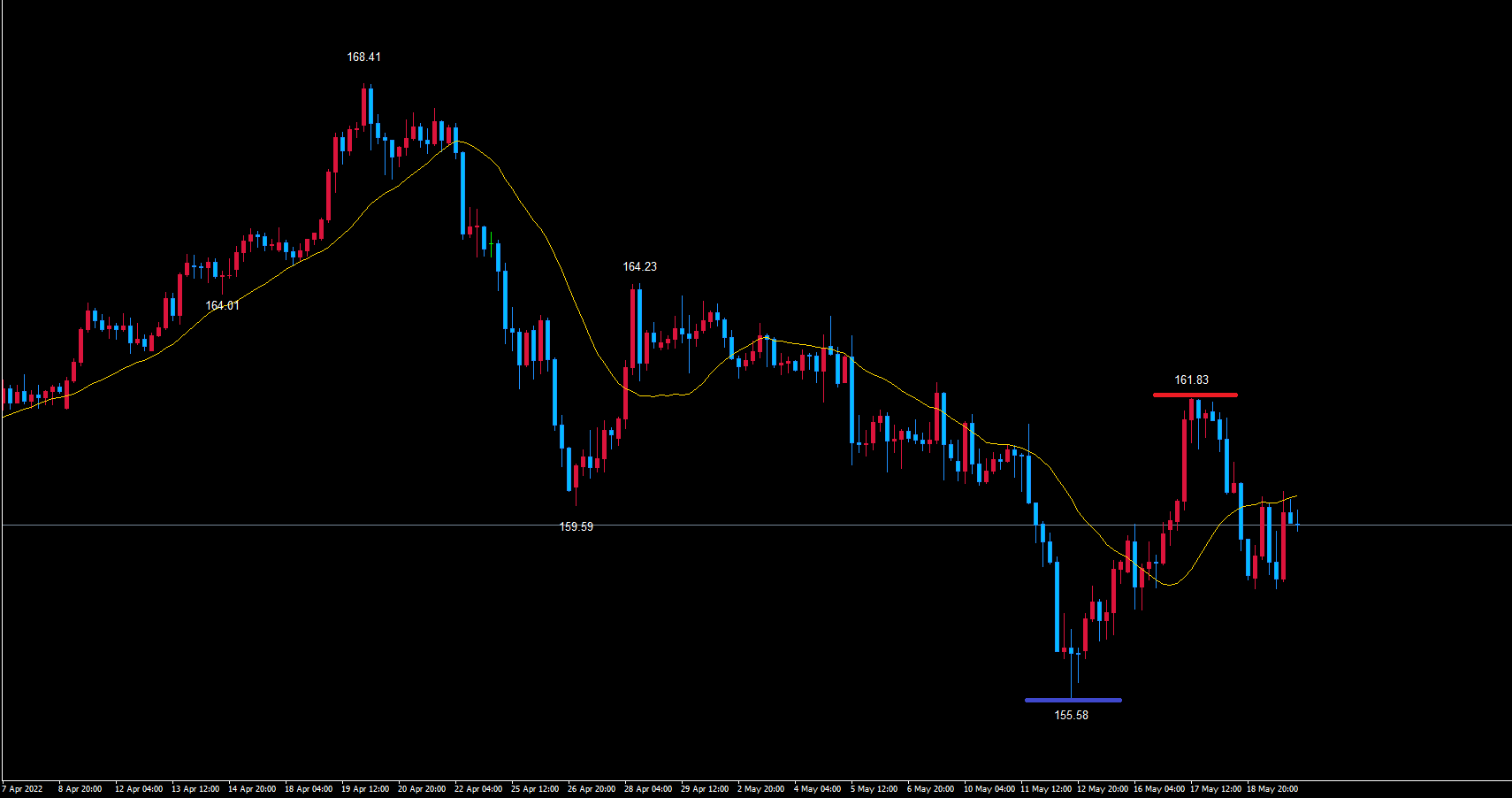 ポンド円4時間サイクルは起点の青のライン155.58から現在34本目です。