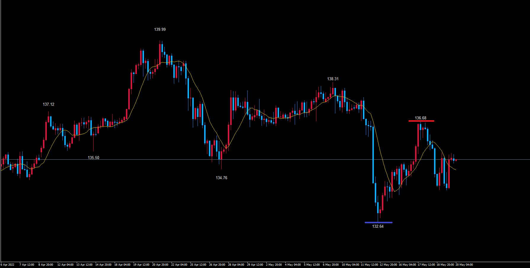 ユーロ円4時間サイクルは起点の青のライン132.64から現在34本目です。