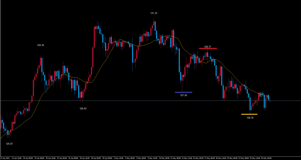 ここは48本目に付けた安値で、基準の本数に入る前の安値なので基本的に黄色のライン126.35を割れてから底を付けると見ています。