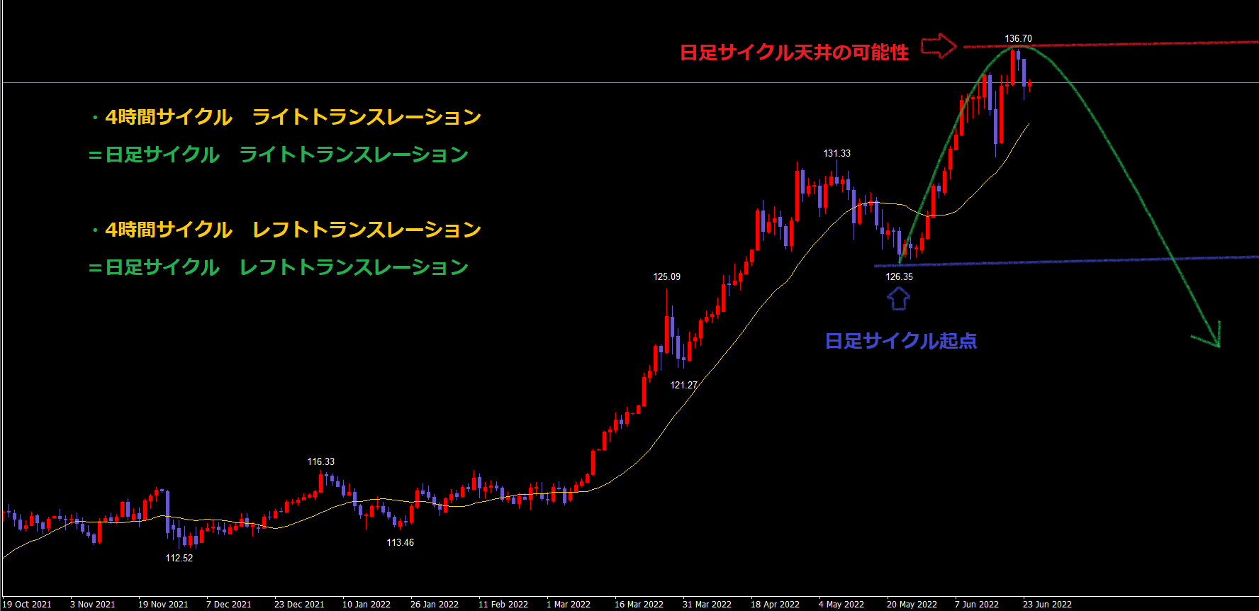 イメージとしては、今回の4時間サイクルのトランスレーション=日足サイクルのトランスレーションというイメージです。