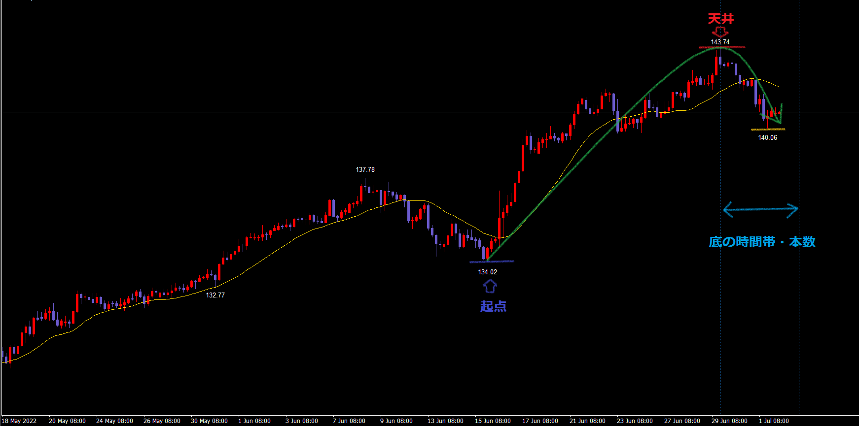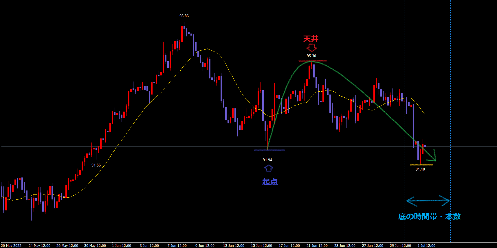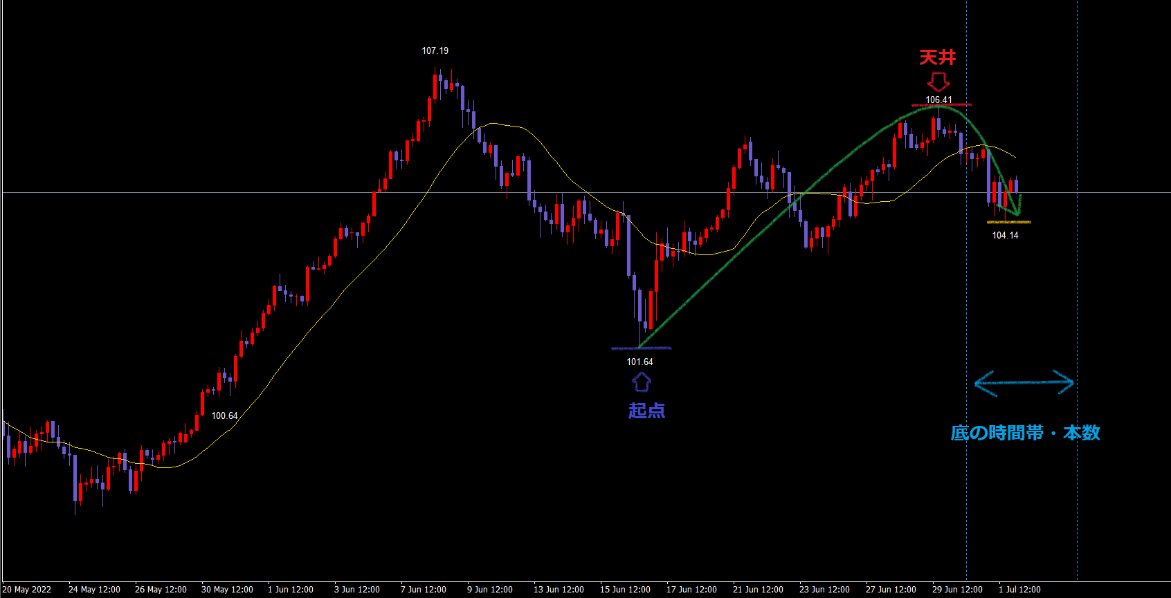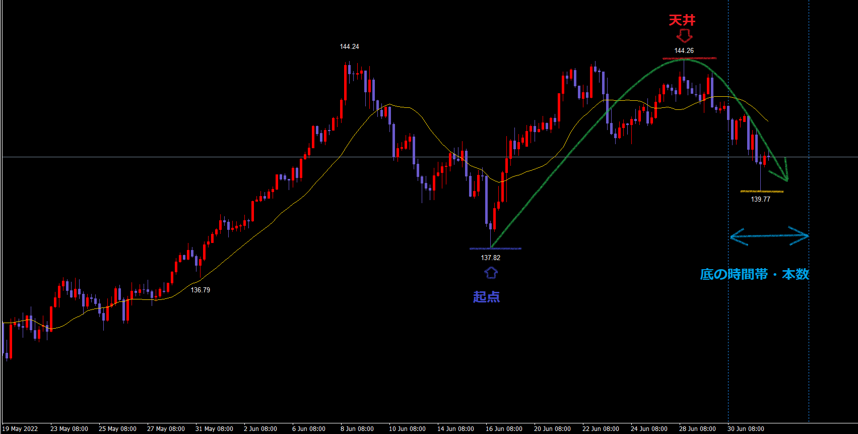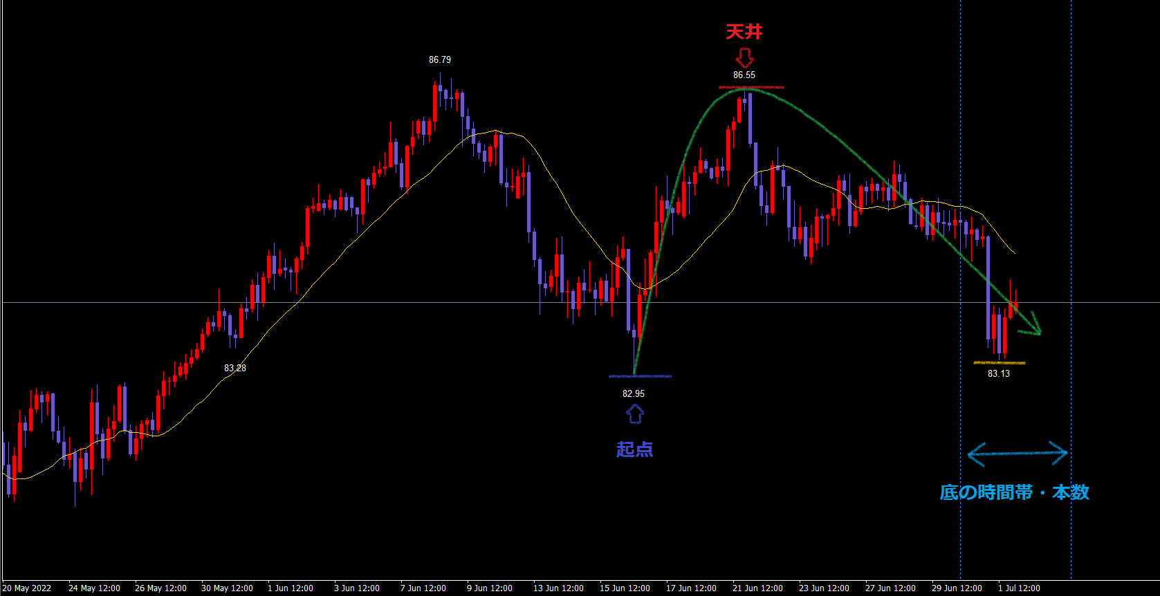 まずは本日安値更新するか、しなければ黄色のラインで次のサイクルに入っていると見ていきます。