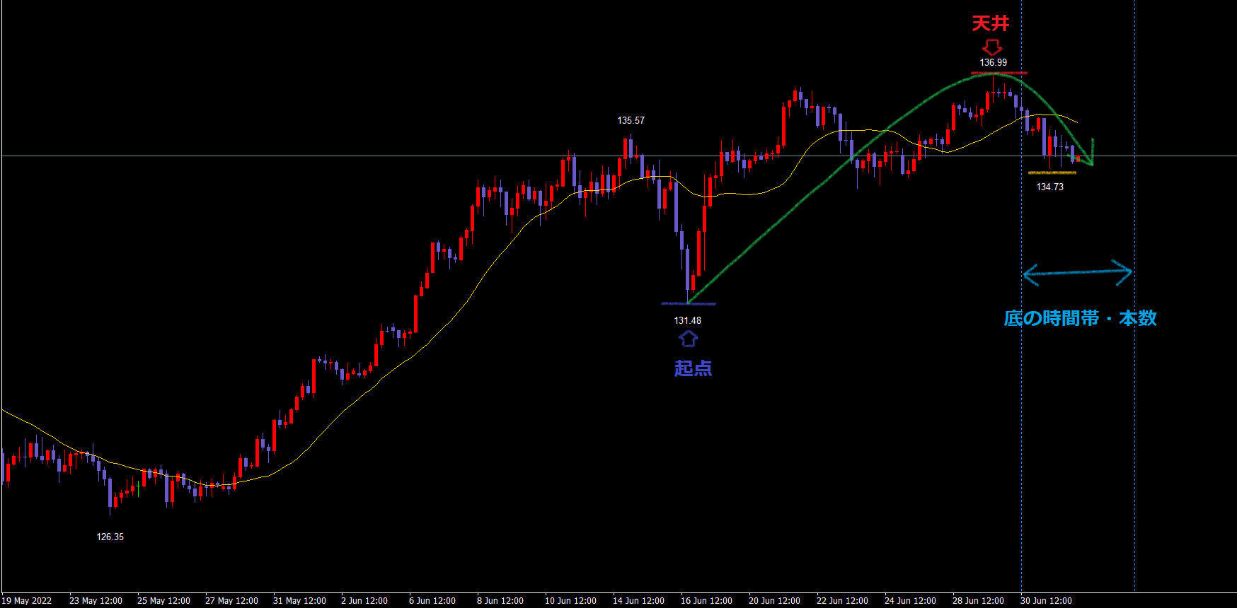ドル円4時間サイクルは、起点の青のライン131.48から現在69本目です。