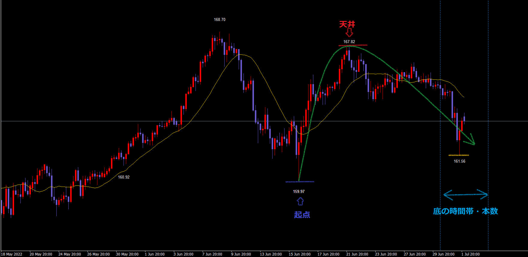 ポンド円4時間サイクルは、起点の青のライン159.97から現在70本目です。