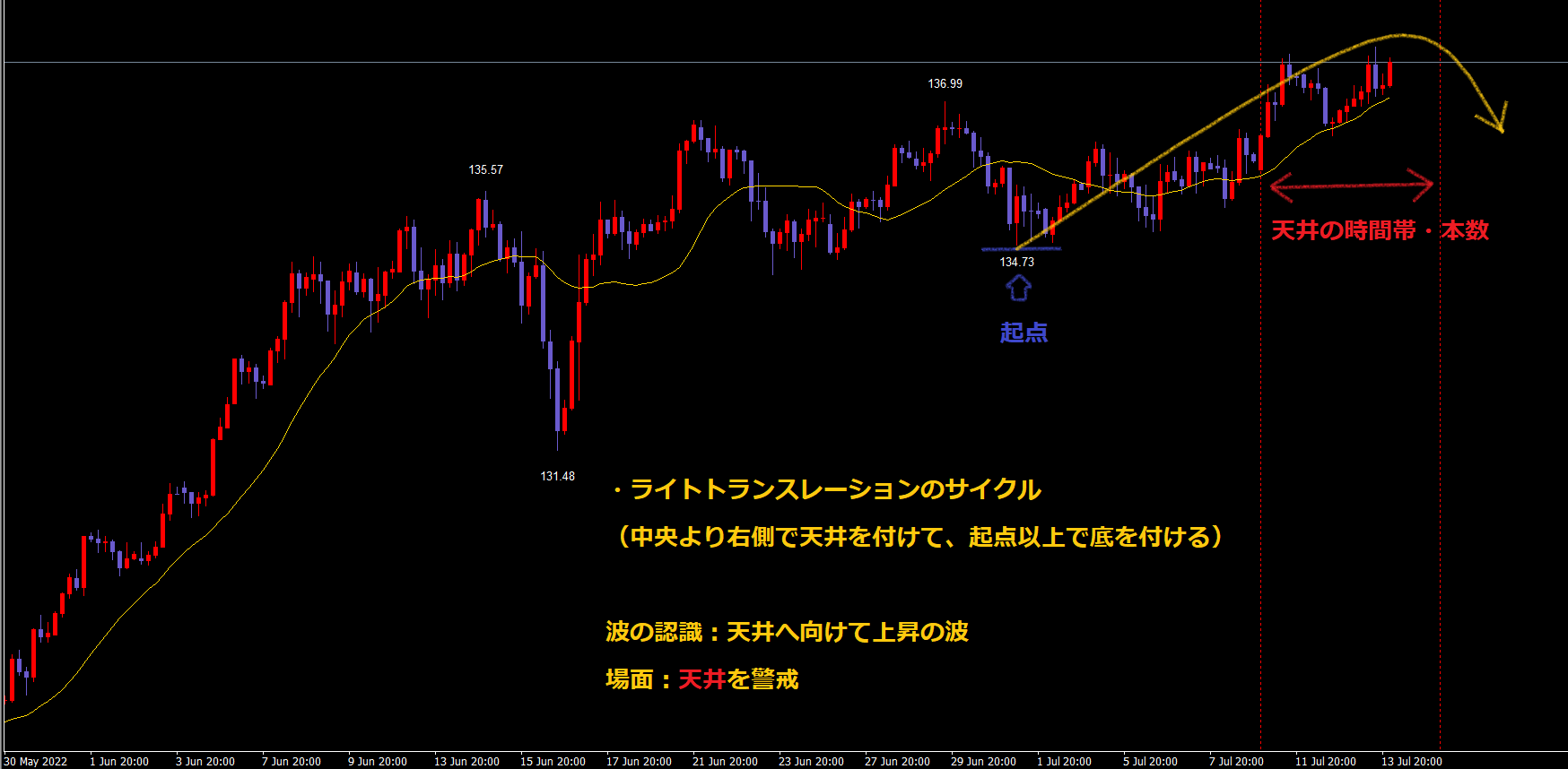つまり、中央より右側で天井を付けて、起点以上で底を付けるサイクルになるという事です。