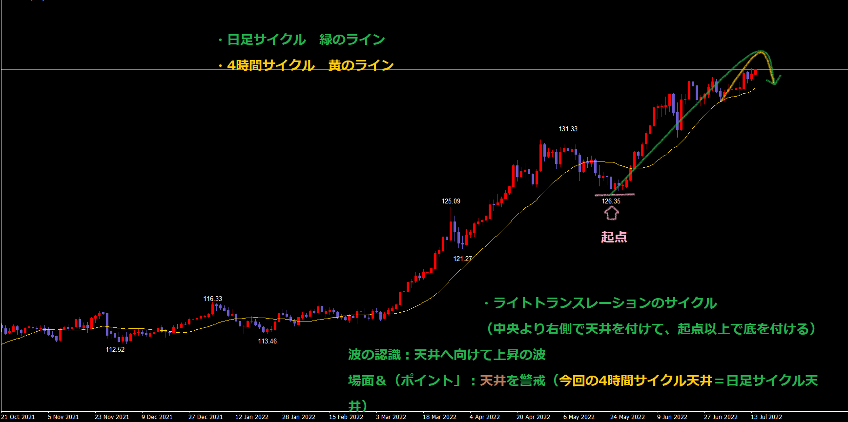 つまり、日足サイクルも中央より右側で天井を付けて起点以上で底を付けるサイクルになるという事です。