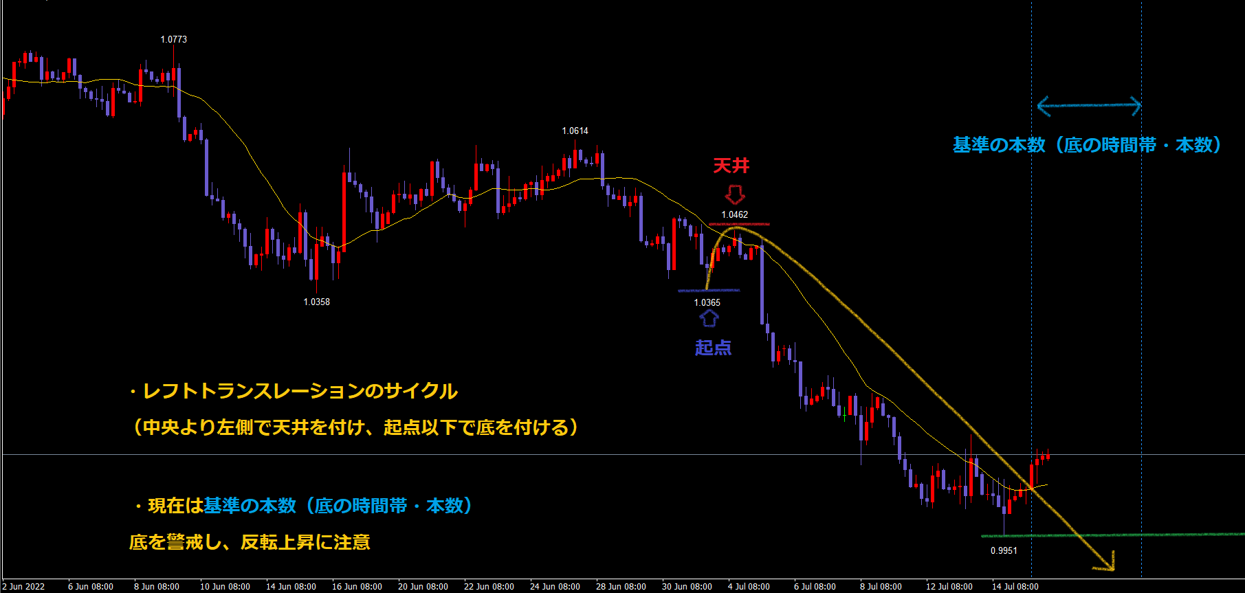 55本目という事は基準の本数(底の時間帯・本数)に入る前に付けた安値なので緑のラインを割れて底を付ける事がセオリーとなります。