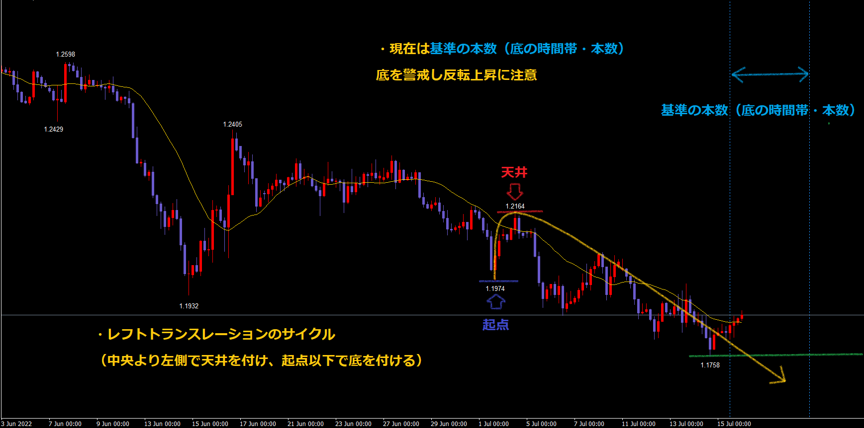 現在はサイクル内最安値緑のライン1.1758を55本目に付けています。