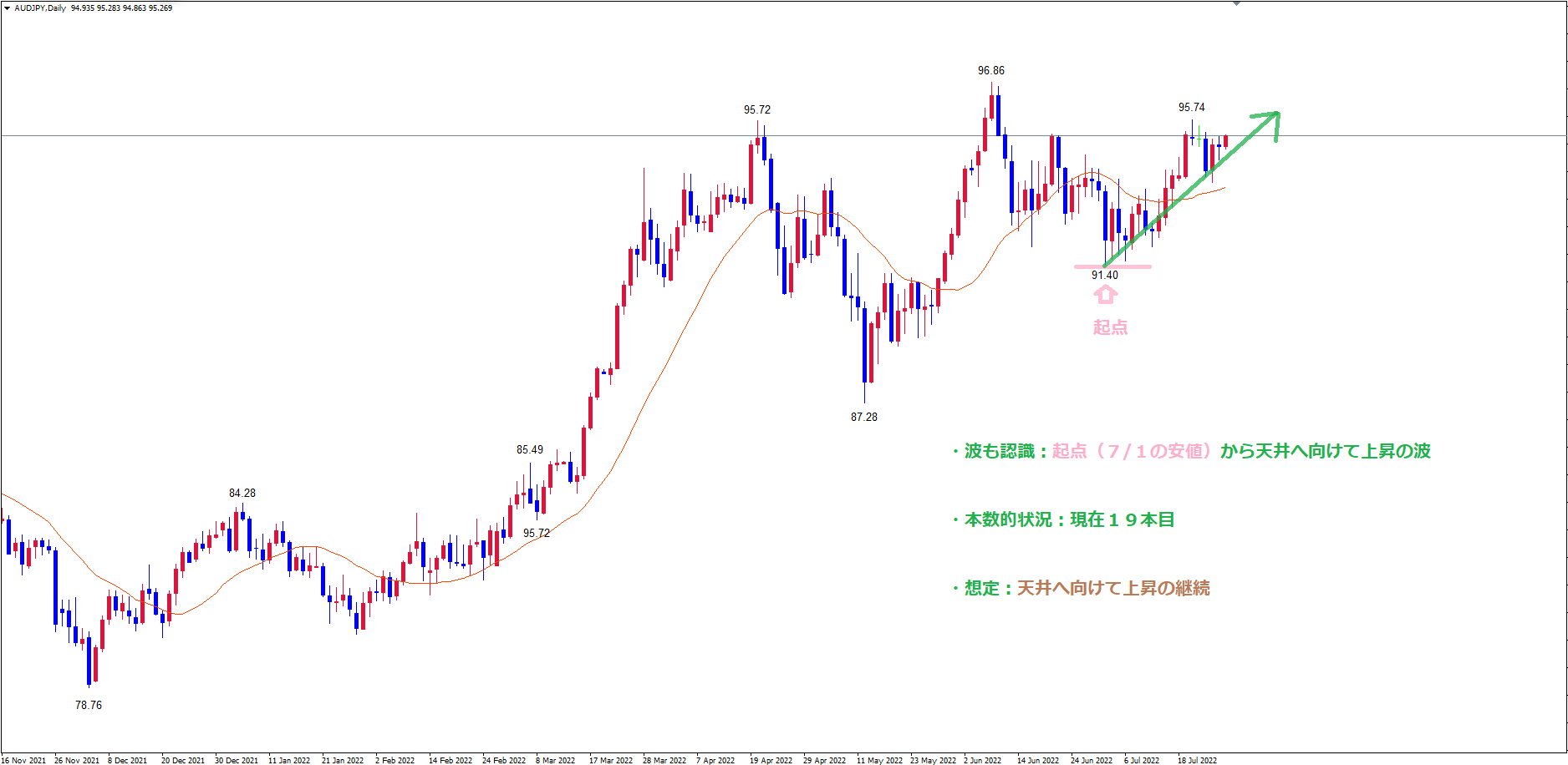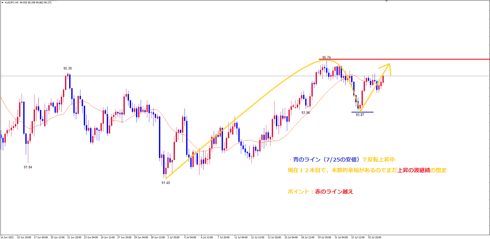 目先のポイントは赤のライン(7/20の高値)95.74で見ています。