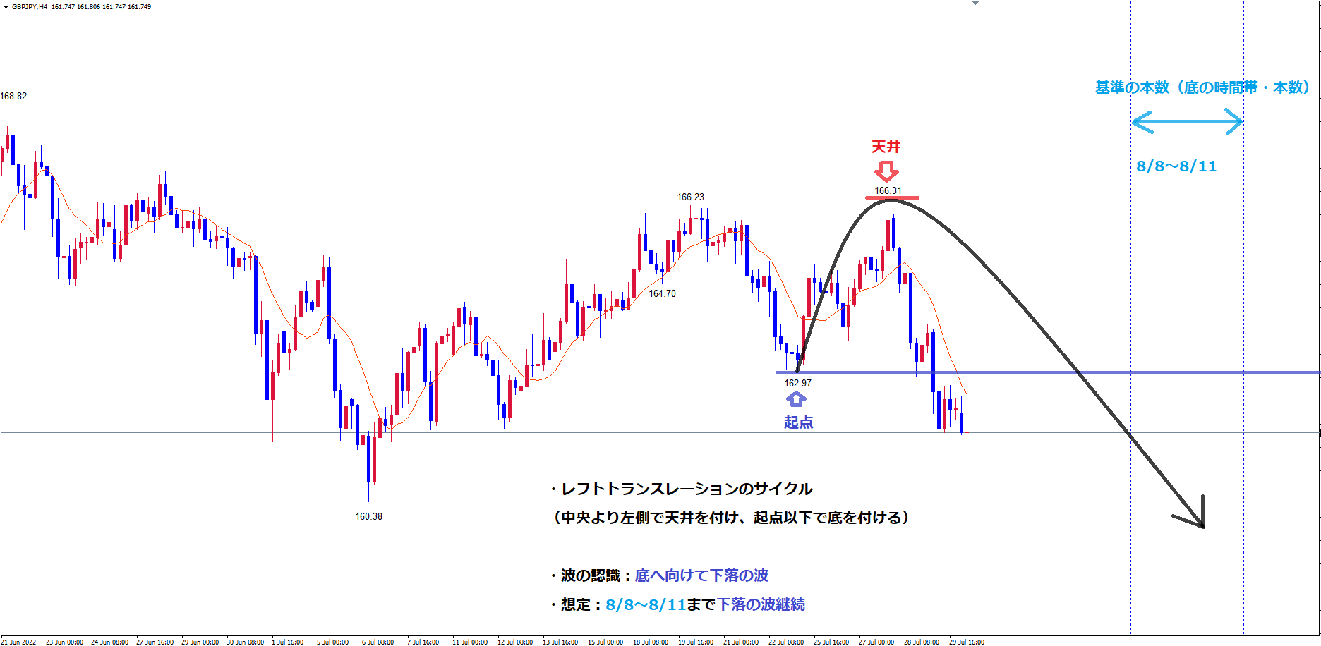 そして、既に起点の青のラインを割れている事でレフトトランスレーションの確定中で、現在は天井の赤のライン166.31から底へ向けて下落中です。